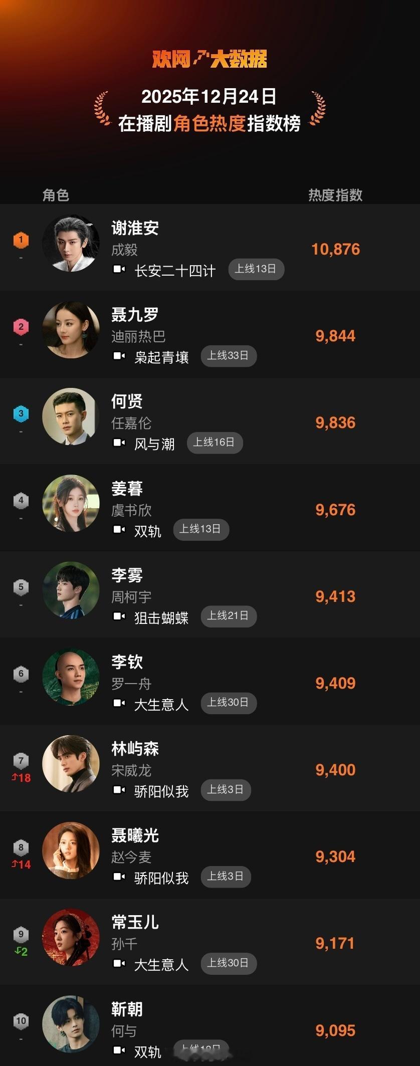 欢网大数据在播剧角色热度指数:成毅《长安二十四计》谢淮安 连续破万登顶!