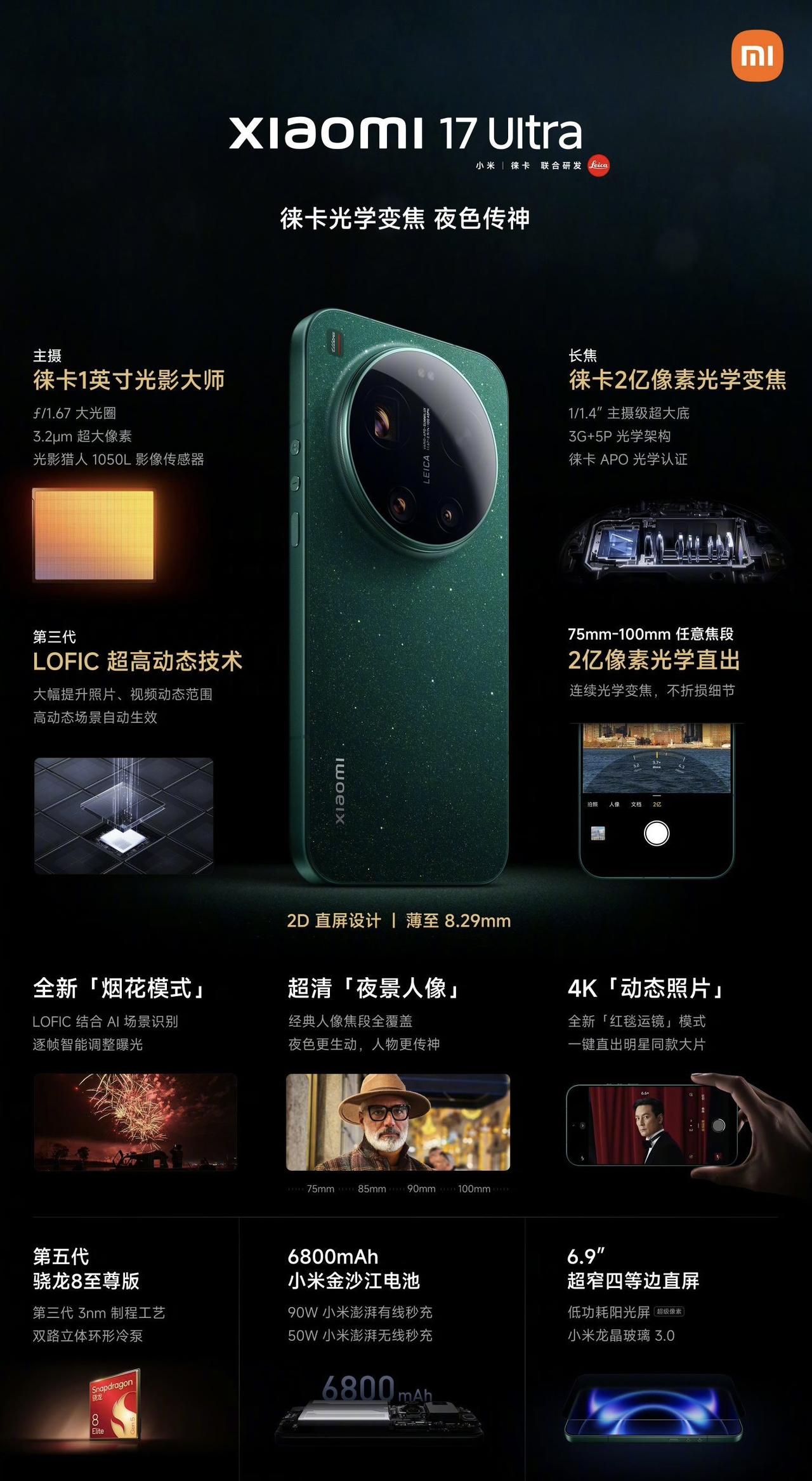 看完小米17Ultra发布会后,发现是我唐突了,起步加料不加价,香麻了!简单总结价格/配置 12G+512GB——6999元 16G+512GB——7499元 16G+1TB——8499元 16G+1TB 双卫星版——8999元 162.9×77.6×8.29mm 核心: ◇骁龙8Elite Gen5 ◇LPDDR5X 内存|UFS 4.1 闪存 ◇澎湃P3快充芯片|澎湃G2电池管理芯片 ◇ 澎湃 T1+ T1S*2 信号增强芯片 ◇ 6.9英寸 OLED 单孔华星M10发光材料直屏丨2608×1200分辨率丨3500nits超级阳光屏丨1-120Hz LTPO自适应刷新率 ◇ 影像 50MP 光影猎人1050L 主摄 OIS f/1.67 50MP S5KJN5 超广角 f/2.2 200MP S5KHPE 潜望长焦 OIS 75-100mm f/2.39-f/2.96 50MP OV50M 前置 其他配置: ◇6800mAh丨90W有线充电|50W无线充电 ◇IP66/68/69 等级防尘防水 ◇USB 3.2 Gen2丨X轴线性马达丨红外丨NFC丨WiFi 7丨5G-A 怎么说呢,在如今内存存储涨疯的情况下,常用的12+512GB规格还保持不涨价,说实在的看到了雷总的坚守。可以说这代是全面提升的一代,无论是外观设计,还是性能影像,都提升了。不过其他规格涨价500和700就感觉很无语了[捂脸] 当然了,小米17Ultra这代估计也会卖爆,iPhone4类似的加减键设计辨识度拉满。完事儿没有可变光圈,但有新技术,可以实现无损移动变焦。不得不说,小米还是挺聪明的[狗头]当然了,一英寸大底主摄搭配LOFIC3.0技术,2亿像素大底长焦,而且还通过了徕卡APO认证,玩儿摄影的知道有多猛 另外为了网络信号,这次用了5颗小米自研的信号芯片。只不过,我寻思价格都来到七八千了,为啥内存不用LPDDR5X Ultra嘞,反正都已经涨价了[狗头],不如让大家觉得更值些。大家说呢?