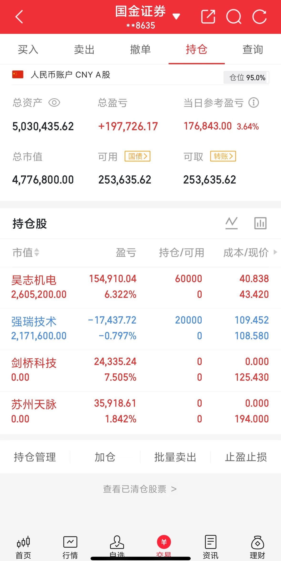 200w本金,目标1年做到1000w,1年翻五倍,欢迎各位关注验证!(第117天)今天买入:昊志机电、强瑞技术今天卖出:剑桥、苏天继续持有:昨天的今天冲高走了,大盘涨的够高了。明天要注意了感谢大家的支持与互动,点赞富一生,评论666股市一路长虹特别声明:这只是我个人的操作记录,不作为任何投资建议,更不是劝你们跟买! 股市有风险,投资需谨慎!股票投资今日股市