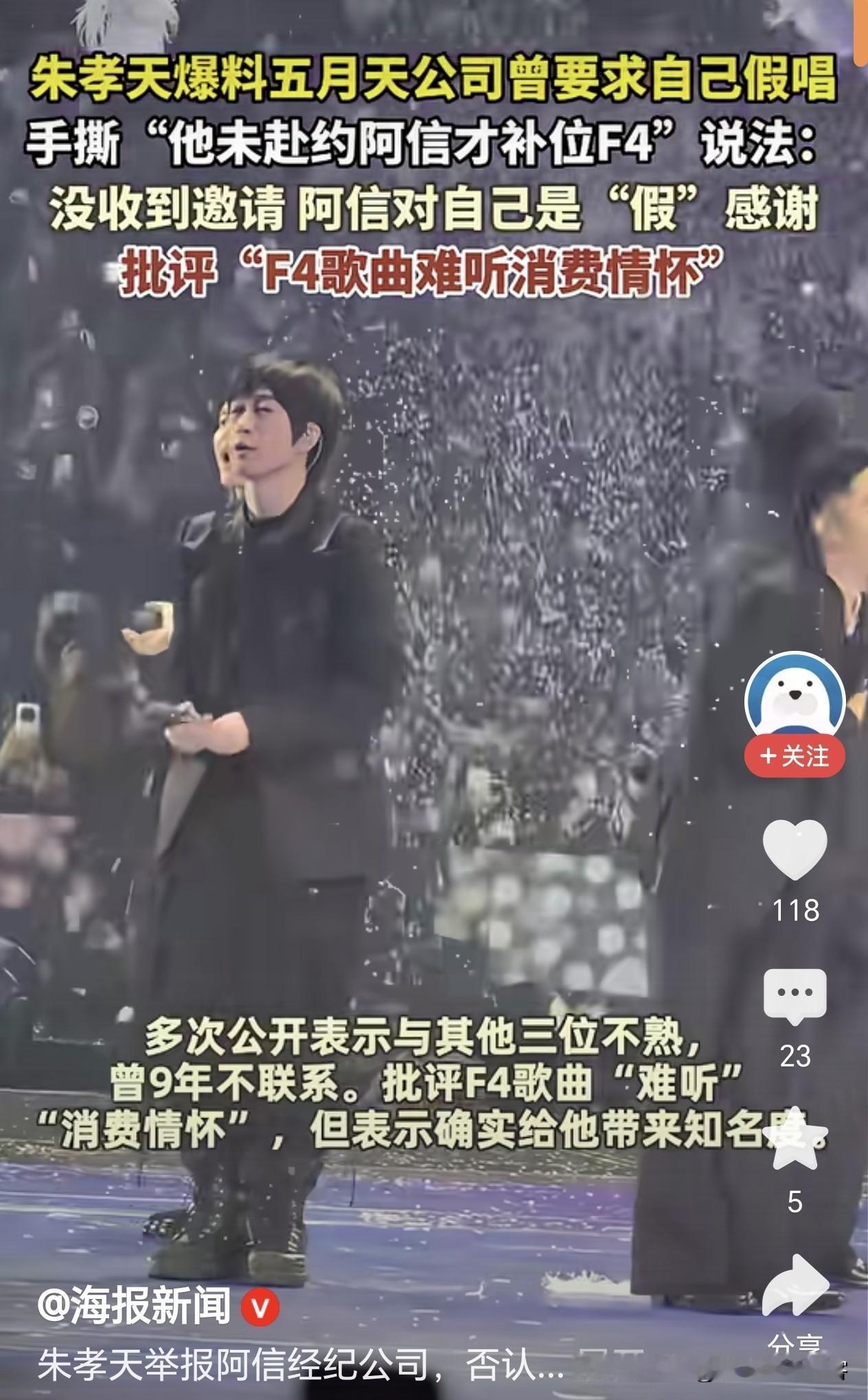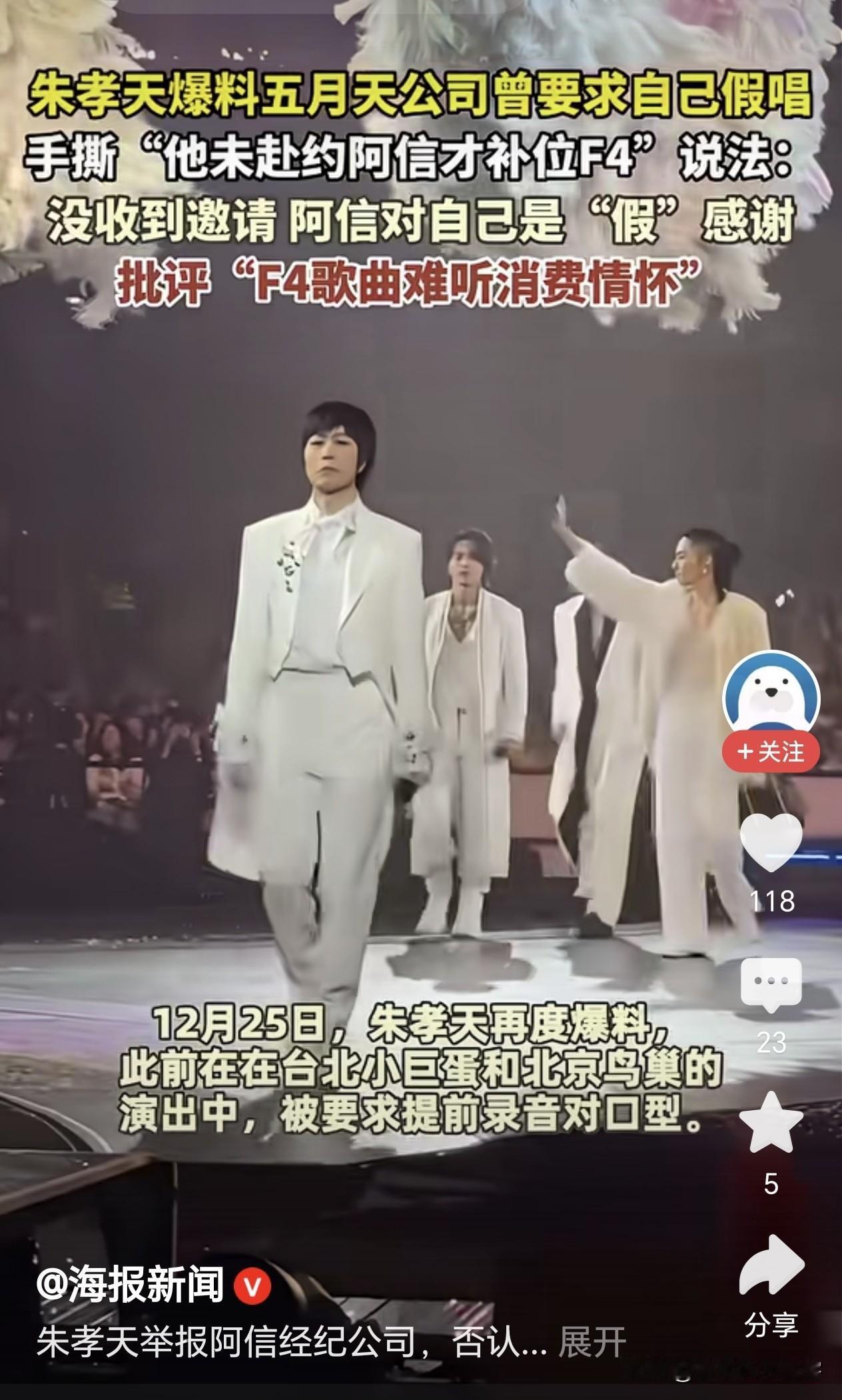 朱孝天和五月天阿信的恩怨,得从F4说起。朱孝天当年作为F4成员,曾多次公开表示和其他三位不熟,甚至9年没联系。12月25日,他再度爆料,称此前在台北小巨蛋和北京鸟巢的演出中,被公司要求提前录音对口型,也就是假唱,这让他很不满。 针对“他未赴约阿信才补位F4”的说法,朱孝天直接手撕,强调自己没收到任何邀请,还直言阿信对自己的感谢是“假”的。此外,他还批评F4歌曲“难听”,认为是在消费情怀,不过他也承认,F4确实给他带来了知名度。 这场争议,既有关于演出安排、假唱的行业问题,也有F4成员间复杂的关系纠葛,再加上和阿信的“补位”风波,让不少粉丝感慨娱乐圈的复杂。吃瓜群众看看就行了!