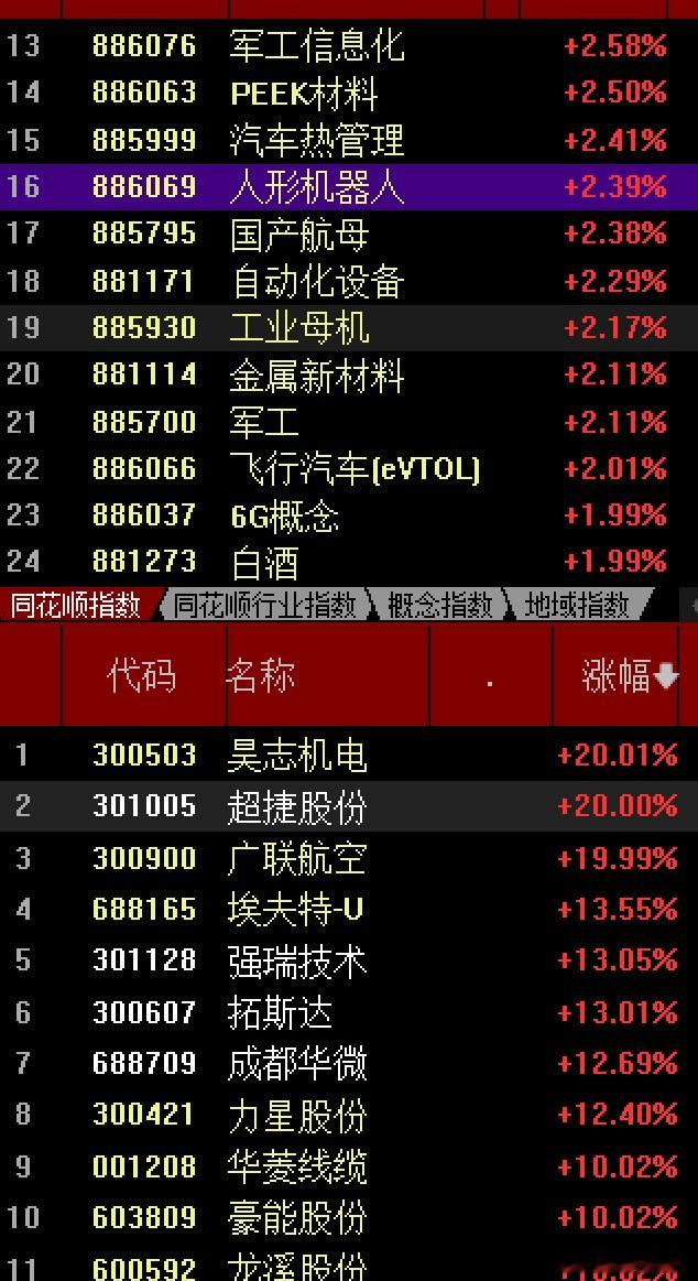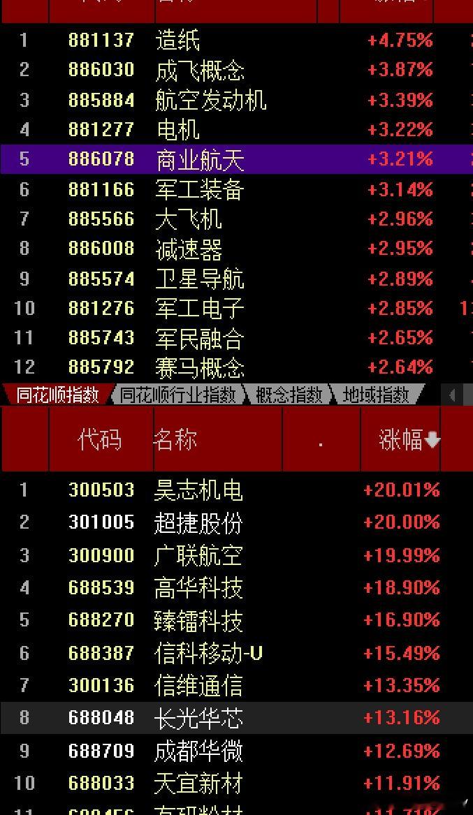 今天大A继续上攻再下一阳,是破了3816点后连拉起来,实现了7连阳,今年大A最长的连阳记录是两次8连阳(8月份和10月份)那这次大A呢,希望明天再接再厉没有只涨不跌的,但回踩也是低吸埋伏的时机在外围圣诞放假下,这两天大A内资自己玩,也算挺好,今天低开一下就顺势向上了,最大的功臣是保险,早盘有一定走弱迹象,但被保险,多元金融等扛住了指数,其中中国太保突破前面四次大山,刷了43元历史新高,而中国平安也刷了年内71.98元新高,助推了上行最高3964点,人气情绪高涨起来了,收3959点这个时候猜指数没意义,更多的是选对板块个股方向来吃肉,最实惠,不然白搭错过吃肉机会前面说过向上突破,需要补量补情绪,现在就差量了今天1.9万亿,起码需要2万亿才可呢,有了量代表才有未来现在市场热点板块依旧轮动加快,你方唱罢我登场,光刻机,机器人,商业航天等,赚钱效应也出来了,今天红3700+家,绿1400+家,涨停93家,比昨天多,跌停2家比昨天减少了12月份宠儿非商业航天主题莫属,持续性活跃,一身牛劲使不完的感觉,如果介入该类概念股妥妥的大肉,今天涨幅超9%以上个股为42家,其中神剑缩量6连版,而超捷实现2连版大长腿,这股在11号左右参与过,中间休整出来了没想到这次搭上了风口起爆,通宇通讯2连版,我中间被阴线洗出去了,哎。中国卫星,信维通信,航天科技航天晨光,臻雷,长光华芯,再升科技等多股领涨,也是大肉的方向现在又衍生到了卫星导航,军工电子融合,航空发动机成飞概念等题材方向,他们是不分家的,航天系大牛为什么会如此,主要是国际竞争行业,加快航空航天产业发展,围绕卫星制造和商业运营环节,引起上下游产业链,涉及到了通信,导航遥感,军工信息化等不过第一梯队涨幅太大了,多注意风险,小心随时退潮,洗盘的动作,但调整后应该还有机会的可控核聚变,中核涨停人形机器人今天终于来了,还好布局的有,宇树科技是催化剂,昊志机电大长腿20cM,叠加多重概念的超捷也有,华菱线缆,浙江荣泰,瑞可达成都华微等上涨关联的减速器,自动化,PEEK材料工业母机等产业链上涨存储,中芯国际等部分涨价,老美又在使坏,要加关税等,还有英伟达产业链关联,人工智能的发展,对半导体,存储芯片,及光刻胶等,国风新材直线涨停,航天智造踩到10日线拉起阳线,其他股你会想到啥其他科技主题逻辑呢,抓主要矛盾今天领跌是贵金属,海南,免税店金属铜等,所以要明白,当市场情绪拉涨的时候,谁是主流,谁是防御a股商业航天