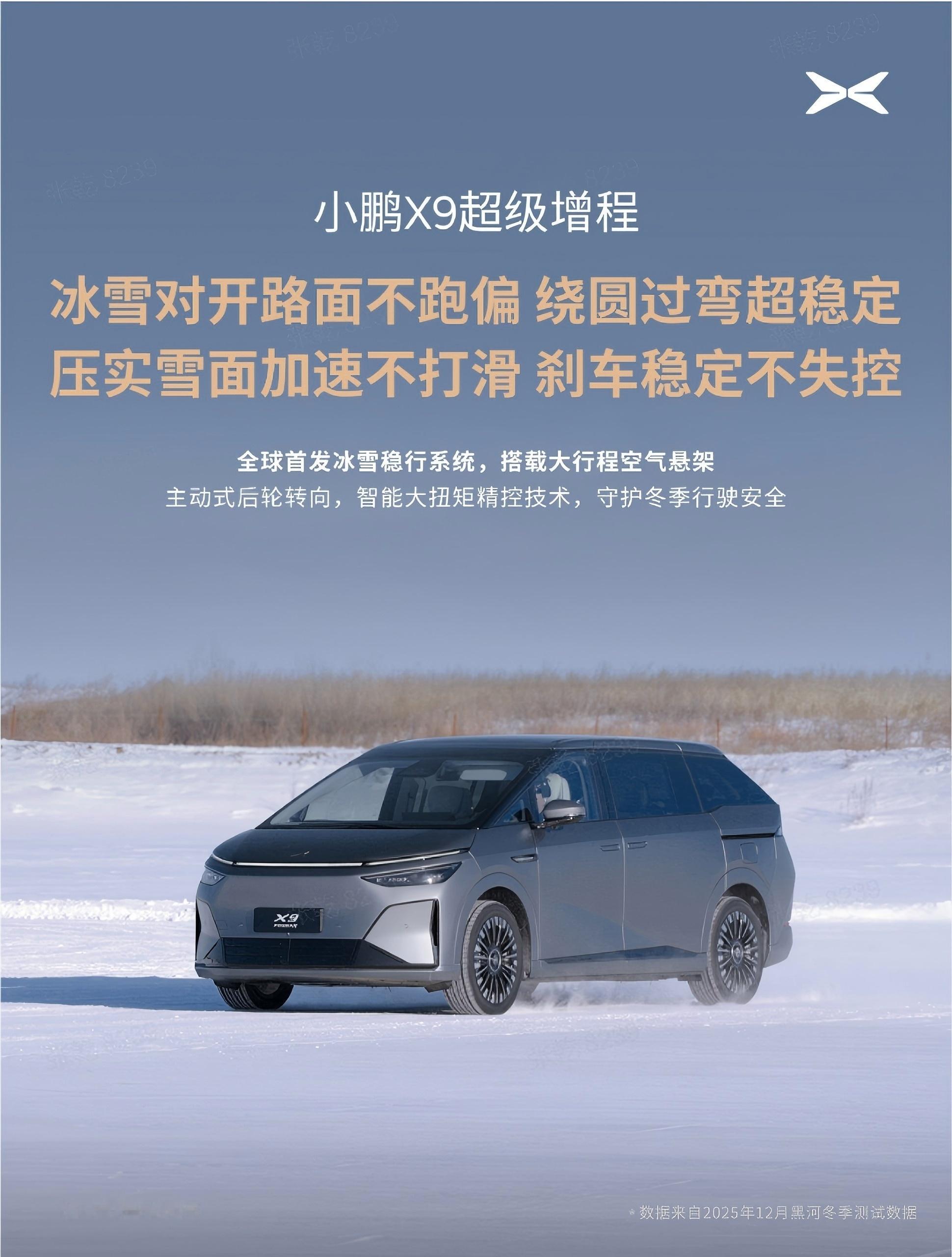 或许大家还记得,2025 年 8 月,小鹏在高温环境下抛出了“冰雪 AES”这个概念,并拉着一众媒体,在并不“冰雪”的条件下,测试低附着路面的 AES 表现。而到了 2025 年 12 月的冬至时节,小鹏干脆把舞台搬进了真正的冬天——在低温、积雪、结冰这些新能源最容易被质疑的场景中,开启了 小鹏 X9 超级增程冰雪体验日。这么做的原因其实并不复杂。在低温地区,新能源的接受程度一直不高,会有很多用户顾虑。但是这也是小鹏一场绕不开,也必须正面应对的硬仗。首先被放到台前的,是冰雪路面的行驶稳定性。这次体验中,小鹏把重点放在了「冰雪稳行系统」上。它并不是单一功能,而是一整套针对冰雪、湿滑、低附着路况重新调校的控制逻辑。这和冰雪AES 的思路一致,但是变成了更系统性的产品特性 核心目标只有一个:让车在复杂路面上更稳、更可控。在起步、脱困以及转向过程中,车辆的动力响应和姿态控制都会更加克制,尽量减少打滑和横向偏移。这也符合北方冬季的用车需求。其次,在低温环境下,小鹏 X9 超级增程也强调了整体热管理能力的提升,联合控制实现11热源回收,充分收集和利用全车热量。 通过更高效的热量回收和更智能的能量分配,车辆在冬季可以更快升温,同时尽量控制能耗,让取暖不再成为续航的负担。换句话说,用户不需要为了省电刻意少开空调,也不必在舒适性和续航之间反复权衡。最后一个绕不开的点,是低温条件下的补能体验。在寒冷环境中,充电慢、效率低,一直是新能源用户最直观的痛点。 X9 超级增程通过高压平台和更完善的温控手段,尽量保证电池在低温下也能维持较高的充电效率,充电速度同级最快,11.7分钟补能70%, 让补能这件事变得没那么“折磨”。从冰雪路面的行驶稳定,到冬季能耗与舒适性,再到低温下的补能体验,小鹏 X9 超级增程用实际的产品力在回应疑虑,也开始系统向北方市场发起进攻。何小鹏冰雪试驾X9超级增程直呼太稳了 小鹏X9在冰雪对开路跑得稳刹得住