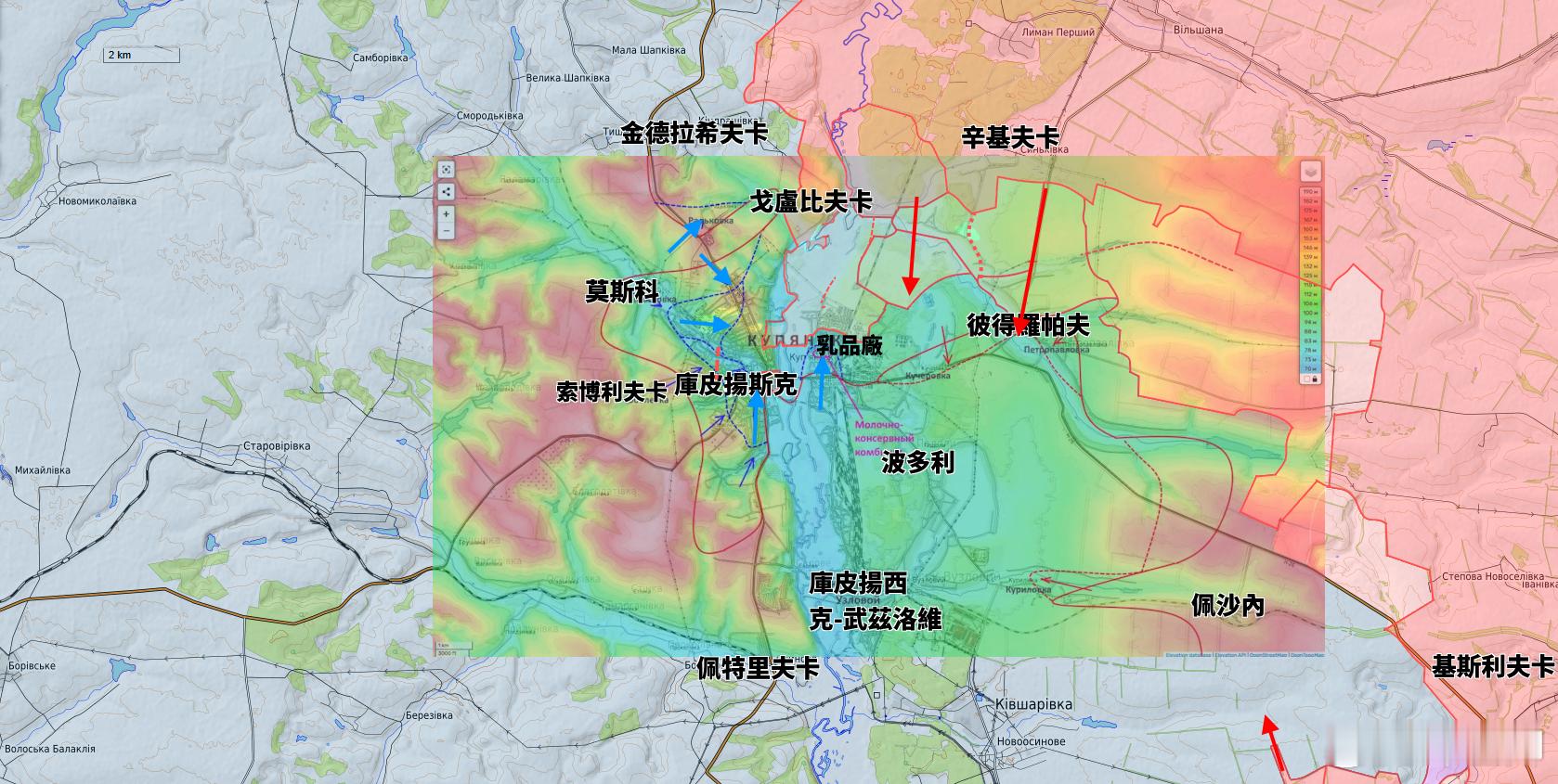 庫皮揚斯克方向,烏克蘭武裝部隊已經佔領該市大部分地區烏克蘭武裝部隊在東岸發動突擊佔領了乳品廠,這使得俄羅斯武裝部隊在西岸的情況徹底絕望,目前被包圍的俄軍很難撤回來,情況與紅軍城如出一轍。很明顯的,俄軍在這裡也犯了寸土不失,但又沒有能力完成防禦任務的錯誤。 戰場的形勢是流動的,孫子說過:「凡用兵之法,將受命於君,合軍聚眾;圮地無舍,衢地合交,絕地無留,圍地則謀,死地則戰,途有所不由,軍有所不擊,城有所不攻,地有所不爭,君命有所不受。」