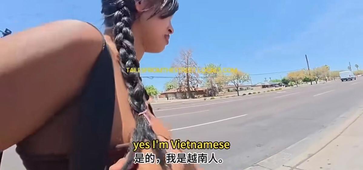 美国斩杀线之越南女孩,最终沦落为J女。 油管网友叫博主去拍这个女子,博主找到她后,连问她两次名字,女子不回答名字,几次说:你先给20美元,你又不是想那个我。她用手遮住了自己的脸。 博主无奈,只得先付20美元,然后女子才说自己叫珍妮,住在凤凰传奇。选择流浪是因为抽了大烟,流浪了四个月。刚说几句话,院子里一个黑人出现,女子乘机走了。博主推着自行车急急跟上。 追上后,博主继续采访,女子说她32岁了,有两个孩子,有父母,3个兄弟,死了两个,父母开着一个餐馆,他们都爱她。博主惑慨亚洲人有爱,很少看到亚洲人当流浪汉,她说对的,她是越南人。现在走路去酒店,不敢睡大街上。 途经一些地方,很多人都认识她,有一把把博主吓到去充电站去溜了一圈,又追上女子。结果女子到了一停车场,一黑车车主说有钱,然后女子就去上了车。