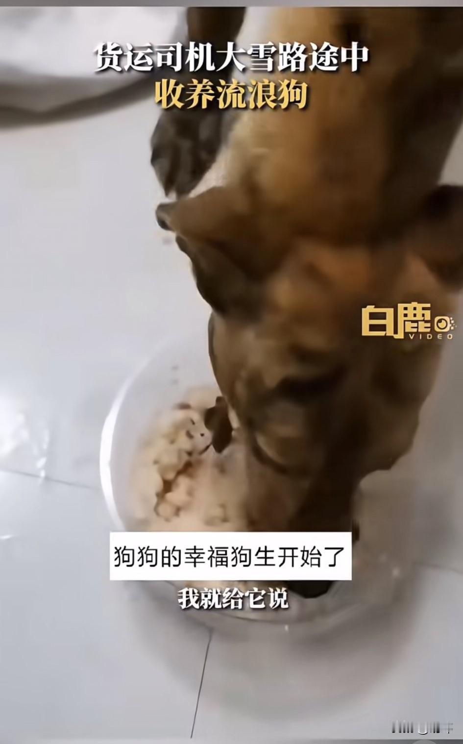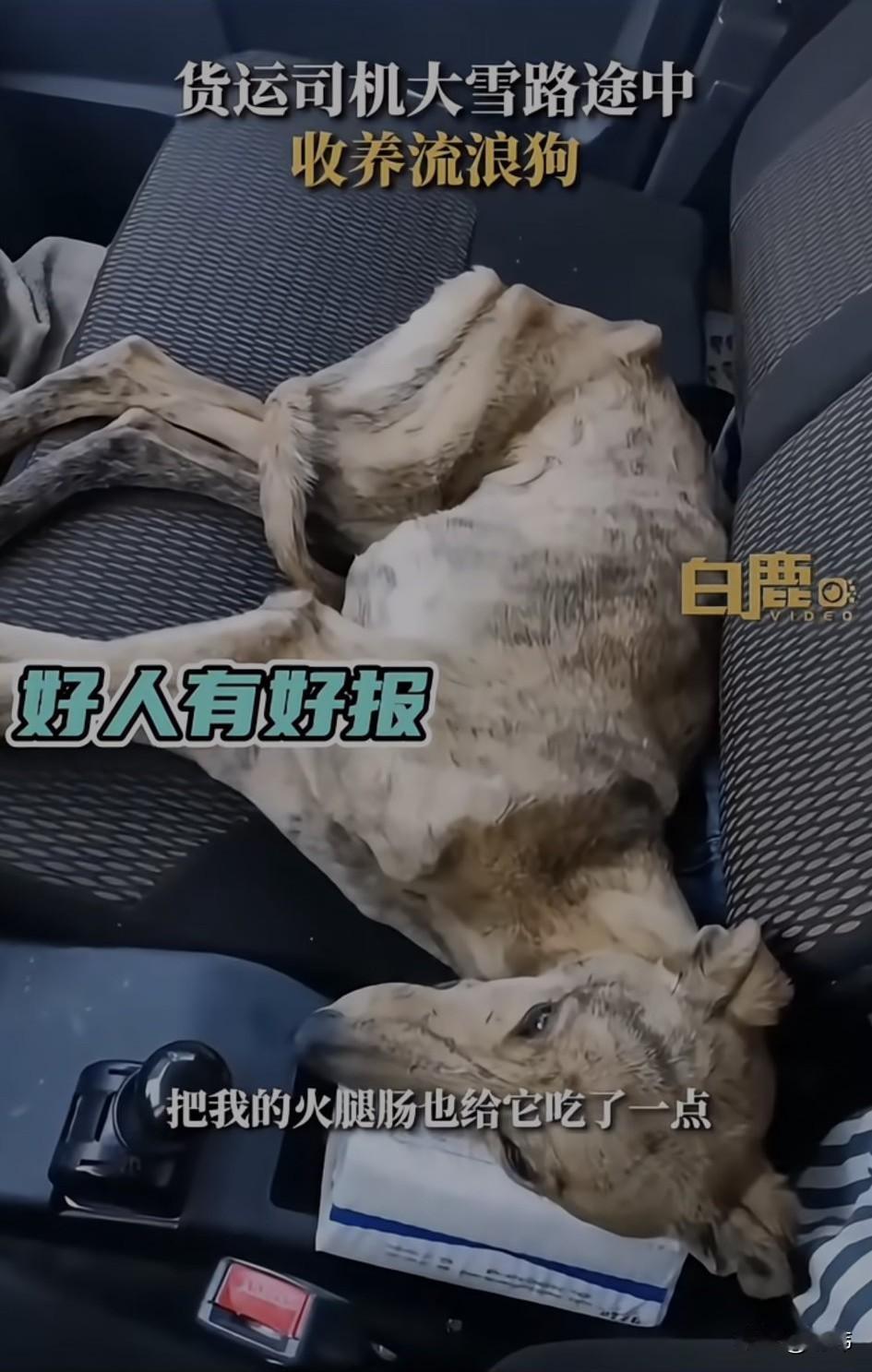 泪目了!一位货车司机大哥开着打车行驶在无边无际的雪地上,他开着开着有些累,于是就停下来休息一会,谁知他看到不远处一只瘦骨嶙峋的流浪狗在另一辆货车前面徘徊,估计是在要吃的。 善良的大哥立刻拿出火腿肠和鸡腿来招待它,它估计闻到了香味也是立刻跑过来,好心的大哥就投喂了它,然后又担心它冷,就把它抱上了副驾驶,大哥又问它愿不愿意跟他走,狗狗似乎听懂了,叫了一声回应它,从此狗狗幸福的生活就开始了!大哥收养了它,带着它走南闯北,它也非常开心能过上这样安逸潇洒的生活。