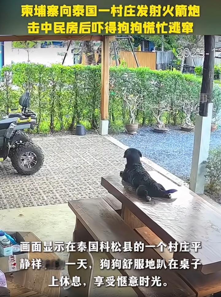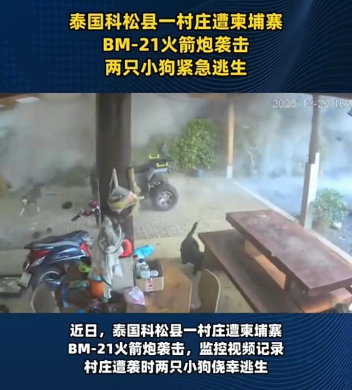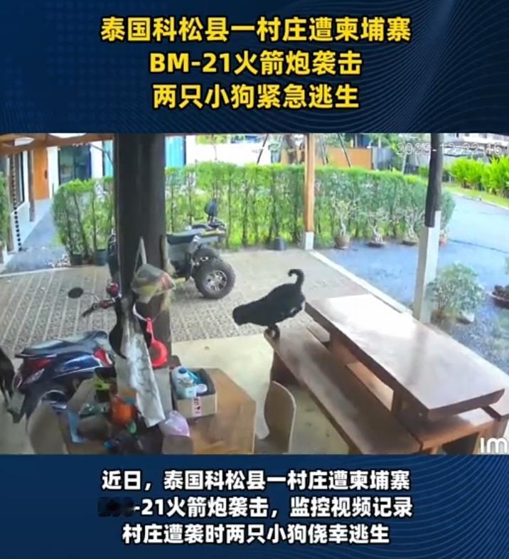 柬埔寨强势还击,位于泰国边境的科松县一村庄遭遇柬埔寨BM—21火箭炮的袭击,监控显示一只小黑在那里悠哉的俯卧,尾巴摇的十分惬意,突然它看向远方以迅雷不及掩耳盗铃之势跳下,以为是他的主人唤它吃午饭。 没想到天空来了一枚火箭弹,瞬间空气中弥漫着尘嚣的飞扬,不得不说这反应.这速度.这走位确实敏捷,本来它是要去房间的,可走了几步发现情况不妙,紧接着一枚火箭弹从天而降,另外还有一只小黄在紧急时刻也成功逃离,不得不说动物的预感远在人类之上,除了它们不会说话,听觉嗅觉极其灵敏,有时候它乱跳或者情绪不好,可能是以自己理解的方式感受到了什么,爱护好自己的狗狗,它们也懂危险与安全,看到它们成功逃离心里还是替它们感到幸运。