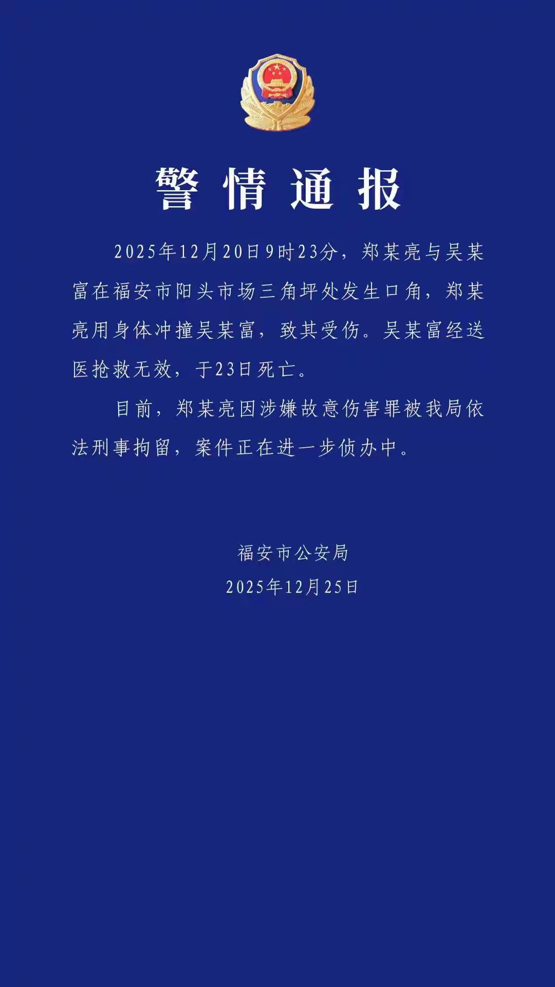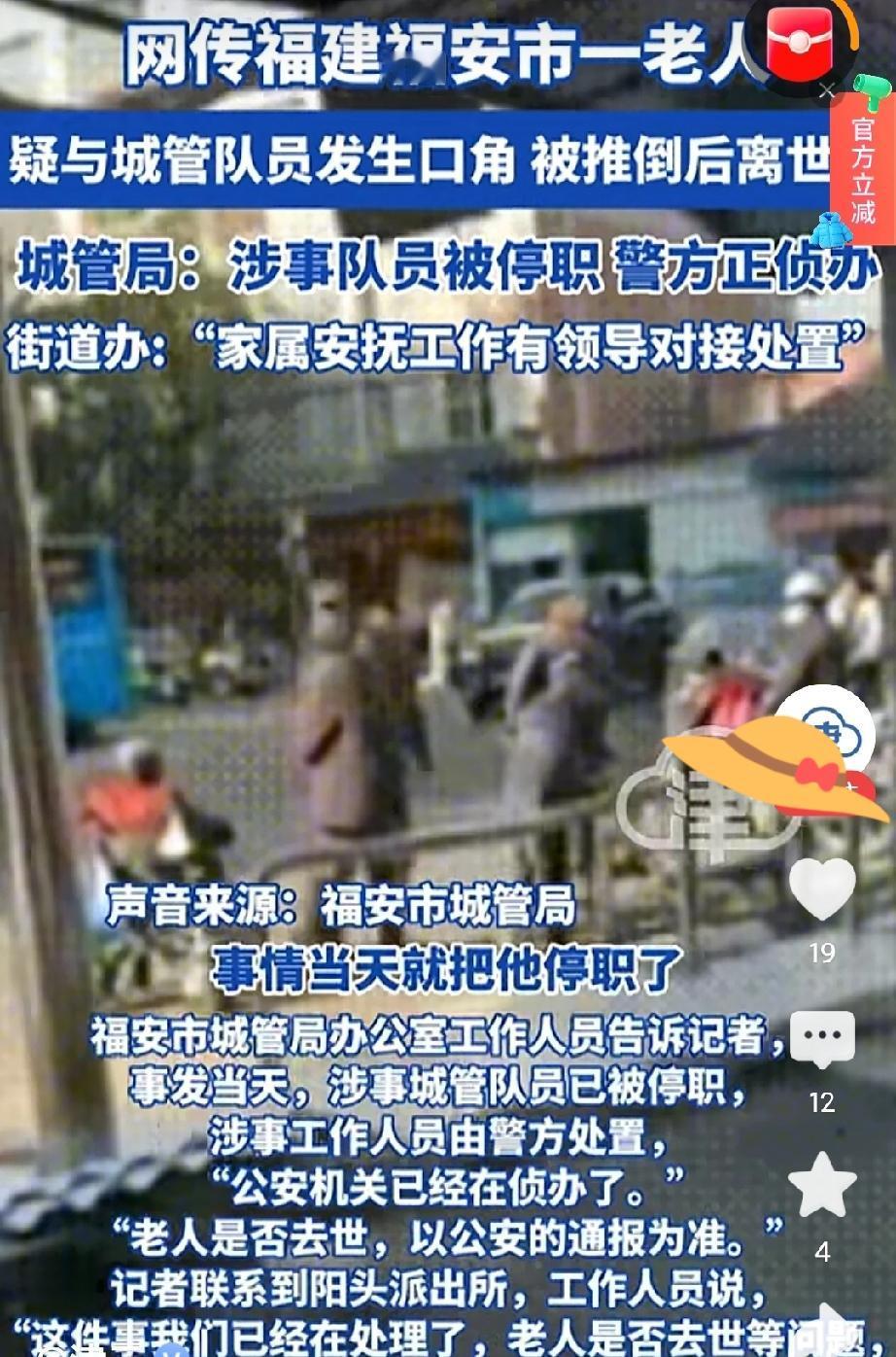 福建有位老人在街头与城管产生了冲突,最终致使老人身亡。 福建福安市阳头市场12月20日发生一起事件。一名叫郑某亮的城管和老人吴某富起了争执,后来两人动手,郑某亮撞了吴某富一下,吴被送医后三天去世了。现在郑某亮被警方拘留,说他涉嫌故意伤害。 当地城管局表示事情正在处理当中,承认涉事的郑某亮是一名临时工,网上有人发布视频,称事情是由于言语争吵之后城管推了老人,不过具体过程监控好像没拍完整,到目前还没有人把当时到底是怎么回事解释明白,不少人这才会产生疑惑。 街头出现这类冲突比较常见,不过通常不会导致人员死亡,此次不一样的是城管具有特殊身份,而且还是临时工,要是按照正式流程来处理情况会不会不一样,当下舆论都集中在监控录像上,可相关部门一直没将它公开,这就令人觉得其中有可疑之处。 全国类似的事情都有出现过,比如说前几年有个地方城管没收摊贩东西的时候,被对方刺伤,最后那摊贩被判定了刑罚,不过每一个案件的细节都不一样。 事发地附近有不少老人靠摆摊维持生活,郑某亮或许是在履行日常的管理职责,据附近居民称,这一片区常常有摊贩占路经营,城管来整治时,很容易引发冲突,但不管是什么原因,发生肢体冲突都是不对的,更不用说最后还酿成了命案了。 现在网上有声音质疑城管系统培训不够,临时工能不能单独执法?有些地方规定临时工只能协助工作,关键岗位必须正式员工。如果吴某富当时是在没上级监督的情况下单独行动,那管理上就有问题。 网络上的热议不断升温,一部分人认为老人年事已高、身体本就虚弱,稍有碰撞便发生意外也在情理之中,甚至推测其本身可能存在未发现的健康隐患,另一部分人则,指责城管在处置过程中过于急躁,不应与老人发生直接冲突,目前只能等待官方发布更详尽的调查通报,若迟迟不予回应,很多重要细节恐怕会逐渐被淡化,最终不了了之 警察已经介入,相信能够查清楚,不过类似冲突在各地不断显现,这说明城市管理确实存着问题,光靠处罚没法解决根本的矛盾,得想办法让执法人员与老百姓都能和睦地进行沟通。