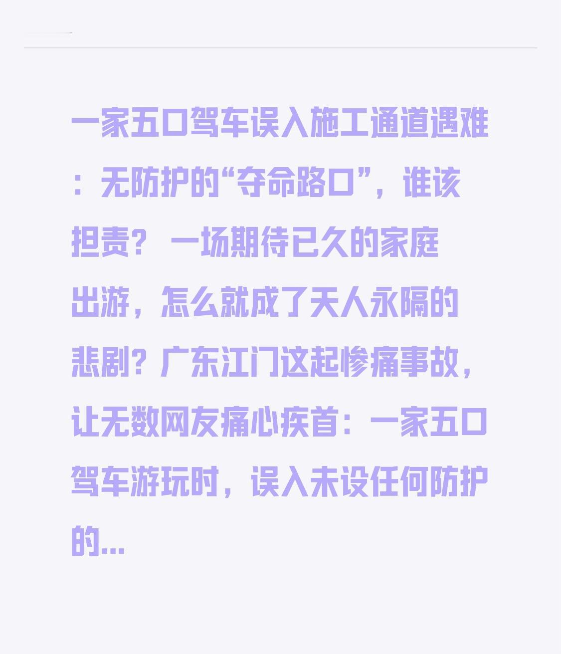 一家五口驾车误入施工通道遇难:无防护的“夺命路口”,谁该担责? 一场期待已久的家庭出游,怎么就成了天人永隔的悲剧?广东江门这起惨痛事故,让无数网友痛心疾首:一家五口驾车游玩时,误入未设任何防护的施工通道,径直坠入西江,4个大人1个孩子全部遇难,而这一切本不该发生! 事发当天,这家人从广州专程前往江门古劳镇游玩,傍晚时分驾车途经南海至新会高速公路配套西江特大桥的施工区域。谁也没想到,这段衔接主桥的临时通行便道,竟然没有设置安全围栏、警示标志,甚至连基本的阻拦设施都没有,就那样赤裸裸地暴露在通行路段旁。 车辆顺着这条“夺命通道”冲下江的瞬间,或许驾驶员还没反应过来——明明是正常行驶的路线,怎么会突然变成悬崖?周边村民后来坦言,早就发现这个施工点安全管控松散,外人能随意进出,大家一直担心会出事故,可没想到悲剧来得这么快、这么狠。 更让人揪心的是,根据《民法典》规定,施工方在道路施工时必须设置明显警示标志并采取安全措施,否则就要承担侵权责任。可涉事施工方显然没尽到责任,既没拦挡也没提醒,让本应封闭的危险区域成了“隐形陷阱”。类似的案例并不少见,此前就有车辆撞上无警示的施工断面,法院最终判决施工方承担80%的主要责任。 这场悲剧也给所有司机敲响警钟:夜间或陌生路段行车,一定要格外谨慎。视线不佳时要减速慢行,遇到疑似施工区域的路段,宁可多绕路也别贸然闯入;同时要提前规划路线,避开施工路段,行车时多观察路边是否有警示标识,遇到路面异常及时避让。 如今涉事施工点已全面停工,相关部门也在推进事故调查和善后,但五条逝去的生命再也回不来了。这起事故不是偶然,而是施工方安全意识淡薄的必然结果。希望这次的惨痛教训,能让所有施工单位绷紧安全弦,别再让“无防护施工”成为夺命隐患。 出行在外,安全永远是第一位的。你觉得施工方该承担全部责任吗?