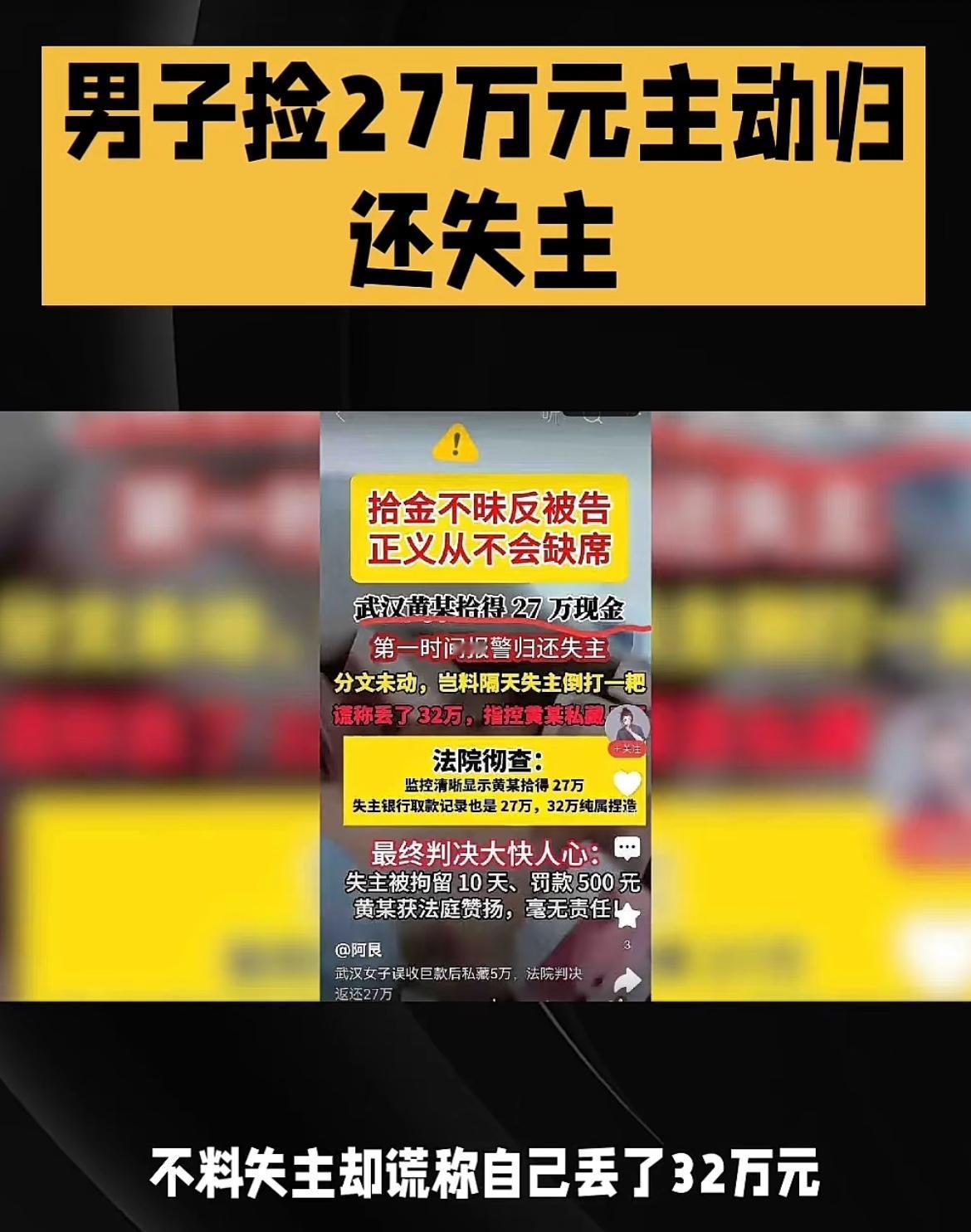 武汉黄某捡27万巨款,拾金不昧反被失主诬告还5万。原来黄某在街头捡到27万现金,丝毫没有据为己有的心思,直接交给警察。等失主过来清点现金后,却说有32万,要求黄某再补5万现金,否则法庭上见。黄某简直觉得比窦娥还冤,明明是做好人好事,为啥还蒙受不白之冤呢?经过法庭的调查走访,发现是失主诬告,还了黄某清白。失主因此被拘留10日,罚款500元。拾金不昧 拾到财物 失主倒打一耙