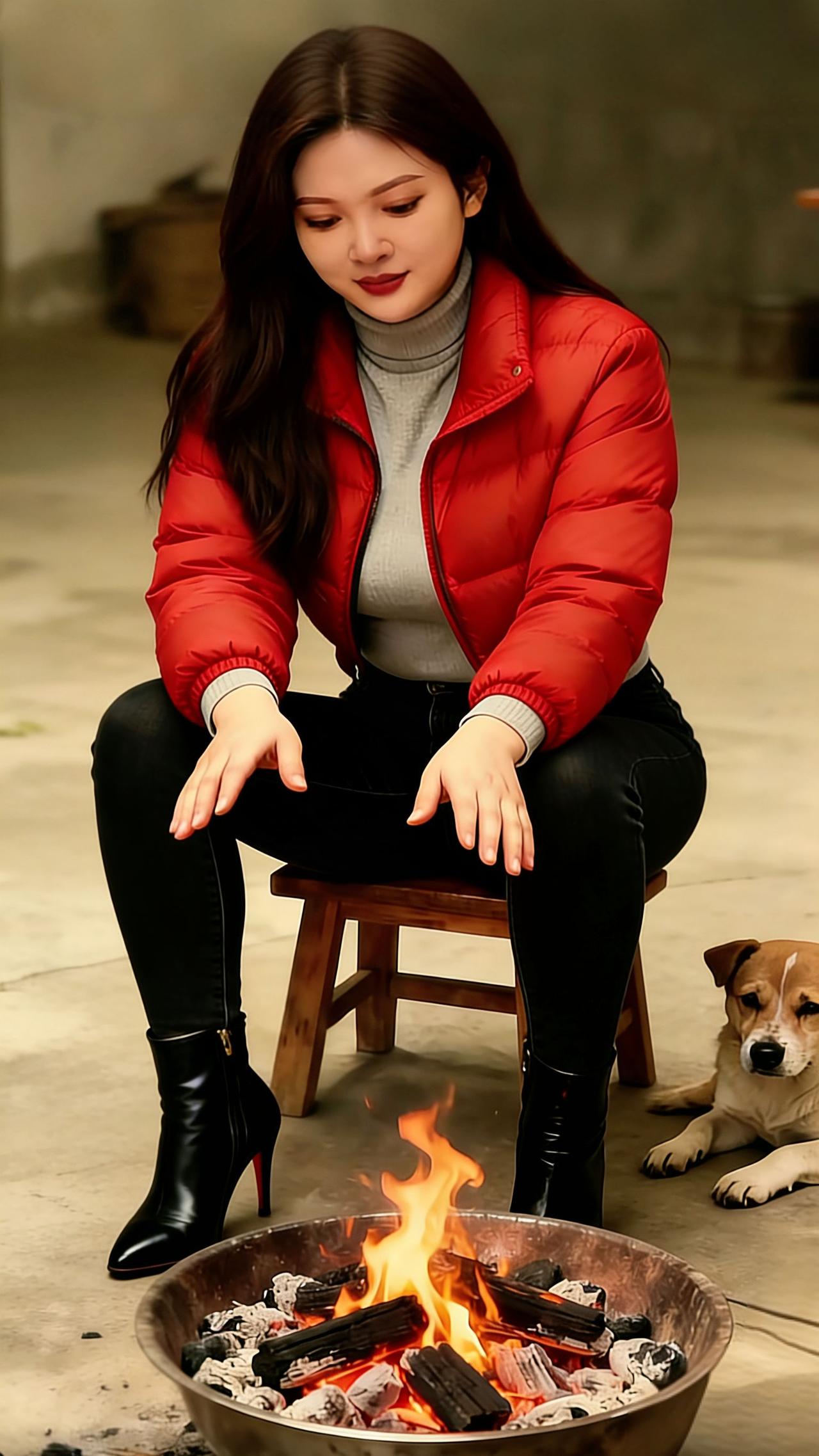 《暖焰围裹的冬辰》 冬风裹着湿凉贴过墙根,她寻张矮凳落了座,红袄像团揉碎的暖阳,裹着绒绒的温软。浅灰高领衬得眉目柔和,黑裤妥帖裹着膝弯,靴面沾了点细尘,却亮得像浸了霜后的星子。 脚边火盆里,焰舌蜷着木柴轻颤,暖光漫过她垂落的发梢,连指尖都浸得暖融融的。小黄狗蜷在侧旁,耳尖随焰声轻晃,把寒意揉成了懒怠的盹。 风从巷口掠过,却绕不开这方暖。她垂眸时,睫毛沾了星点焰光,像把细碎的温柔,和火盆里的光缠在一起——原来冬日的暖从不是烈阳铺陈,是烟火落在寻常里,是有人与你,共守一炉轻暖。 冬日暖意 寻常烟火
