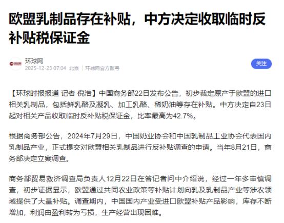 被中方果断反制后,马克龙向欧盟紧急求援! 中方近日开始对欧盟部分进口乳制品加征临时反补贴税保证金,最高可达42.7%。 而就在措施生效当天,法国政府就致电欧盟,要求欧盟采取行动,回应中方对欧盟乳制品加征的反补贴关税。 法国之所以反应这么激烈,甚至急到要向欧盟求援,核心就是它在欧盟乳制品对华出口中占了太大的份额,简直是把鸡蛋都放在了中国市场这个篮子里。 欧盟乳制品对华出口总量占了全球同类产品对华出口的94.3%,而法国就包揽了其中37%左右的份额,相当于欧盟对华乳业出口的半壁江山,像罗克福蓝纹奶酪、卡芒贝尔软奶酪这些法国标志性产品,早就靠着中国市场赚得盆满钵满。 更关键的是法国本土乳制品市场早就饱和了,中国市场是他们最核心的海外增量来源,不少企业都把未来增长的希望全押在了这里。 中方这次出手可不是一时兴起,早在2024年8月就正式对欧盟相关乳制品发起了反补贴调查,经过一年多的审慎核查,包括发放问卷、召开听证会、实地走访企业等一系列流程,最终确认欧盟通过共同农业政策等计划,给本土乳制品产业提供了大量补贴。 这些享受补贴的欧盟乳制品进入中国市场后,直接导致国内相关产业出现库存积压,利润从盈利变成亏损,生产经营陷入困境,中方采取临时反补贴措施完全是按规则办事。 更有意思的是这次被抽查的15家欧盟企业里,有12家都是法国企业,而被征42.7%最高税率的企业,清一色全是法国公司。 这意味着法国那些高端奶酪想继续进入中国市场,成本会直接飙升,原本的价格优势彻底消失。法国国家乳制品工业联合会都直接表态,说中方这一措施对他们而言就是一场沉重冲击,一点都不夸张。 马克龙其实早有预感,12月初他时隔两年再度访华,核心任务之一就是劝说中方不要对法国乳制品和猪肉加征关税,可最终还是没能拿到想要的结果。 回到法国没几天,他就在媒体采访中放话,若中欧贸易失衡长期存在,欧盟可能会“被迫”对中国商品加征关税。话音刚落没几天,中方就公布了乳制品反补贴初裁结果,这波反制可以说是精准又及时。 说白了这一切都是法国自己埋下的伏笔,去年10月欧盟对中国电动车加征高额关税,背后主要推手就是法国。 中方当时还主动提出设置出口最低价格等方案,希望和平解决争端,就像当年处理中欧光伏争端那样。 甚至在2025年全年,中方都没对欧方发起任何新的贸易救济调查,仅对3起旧反倾销案件作出终裁,可欧盟却得寸进尺,全年对华发起15起贸易救济调查,18起初裁征税、18起终裁征税,光12月19日一天就新发起3起调查。 马克龙现在急着向欧盟求援,可欧盟内部根本没法形成统一立场。 德国这些工业强国之前一直支持对华电动车加税,因为能保护本土汽车产业,可乳制品不是他们的软肋,对中方反制这事根本不上心。 匈牙利等国本身就和法国在对华政策上有分歧,更不可能主动帮忙,马克龙想拉着27国一起对华施压,大概率是竹篮打水一场空。 中方其实一直保持克制,反复强调愿意通过对话协商解决贸易摩擦,可前提是欧盟得拿出诚意。 现在法国乳制品产业陷入困境,本质上是欧盟贸易政策失衡导致的后果。中国市场从来都不是谁的后花园,想一边享受中国市场的红利,一边搞贸易保护主义打压中国产业,这种好事根本不存在。 接下来就看欧盟怎么选择了,要是继续坚持强硬态度,不调整对华贸易政策,法国乳制品产业的损失只会越来越大,甚至可能影响到中法、中欧更多领域的合作。 要是能认清现实,主动回到谈判桌前解决分歧,中方也不是不能重新考虑。毕竟在全球经济相互依存的今天,搞贸易对抗没有赢家,最先扛不住的,永远是那些把鸡蛋放在一个篮子里的国家。