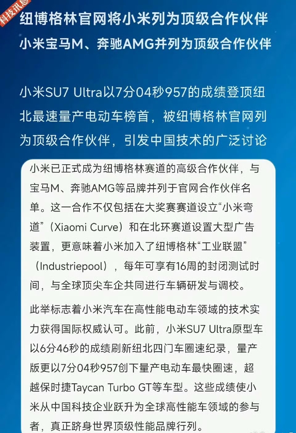 顶级的企业在顶级的圈子。毋庸置疑的纽博格林不会因为小钱而自降自己在行业内顶级的身价。黑子不要造谣了,睁大眼睛看看世界吧!小米!宝马M!奔驰AMG!这三个是官方合作认证,全球一堆车企,只有这三家拿到了!小米牛逼,中国牛逼!