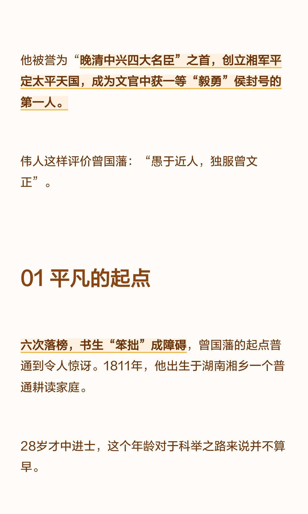 他被誉为“晚清中兴四大名臣”之首,创立湘军平定太平天国,成为文官中获一等“毅勇”侯封号的第一人。