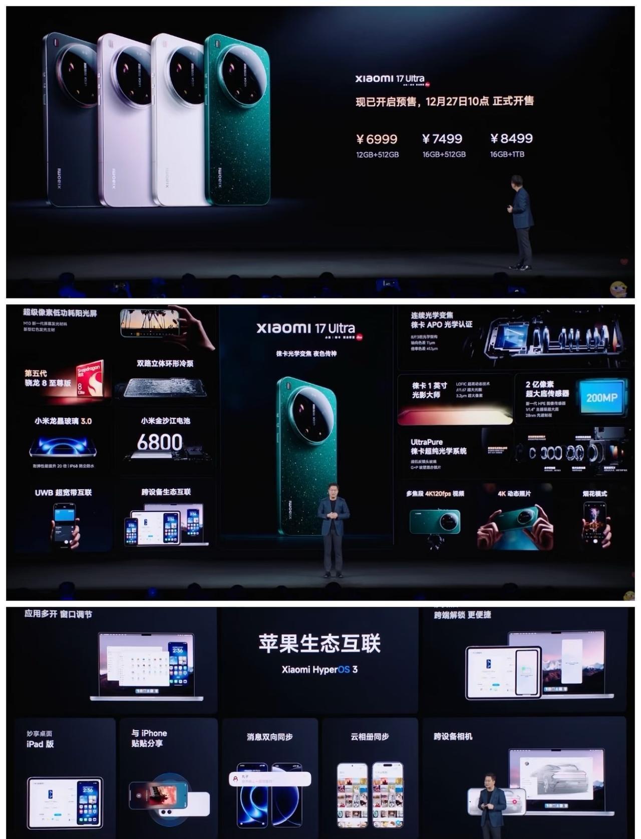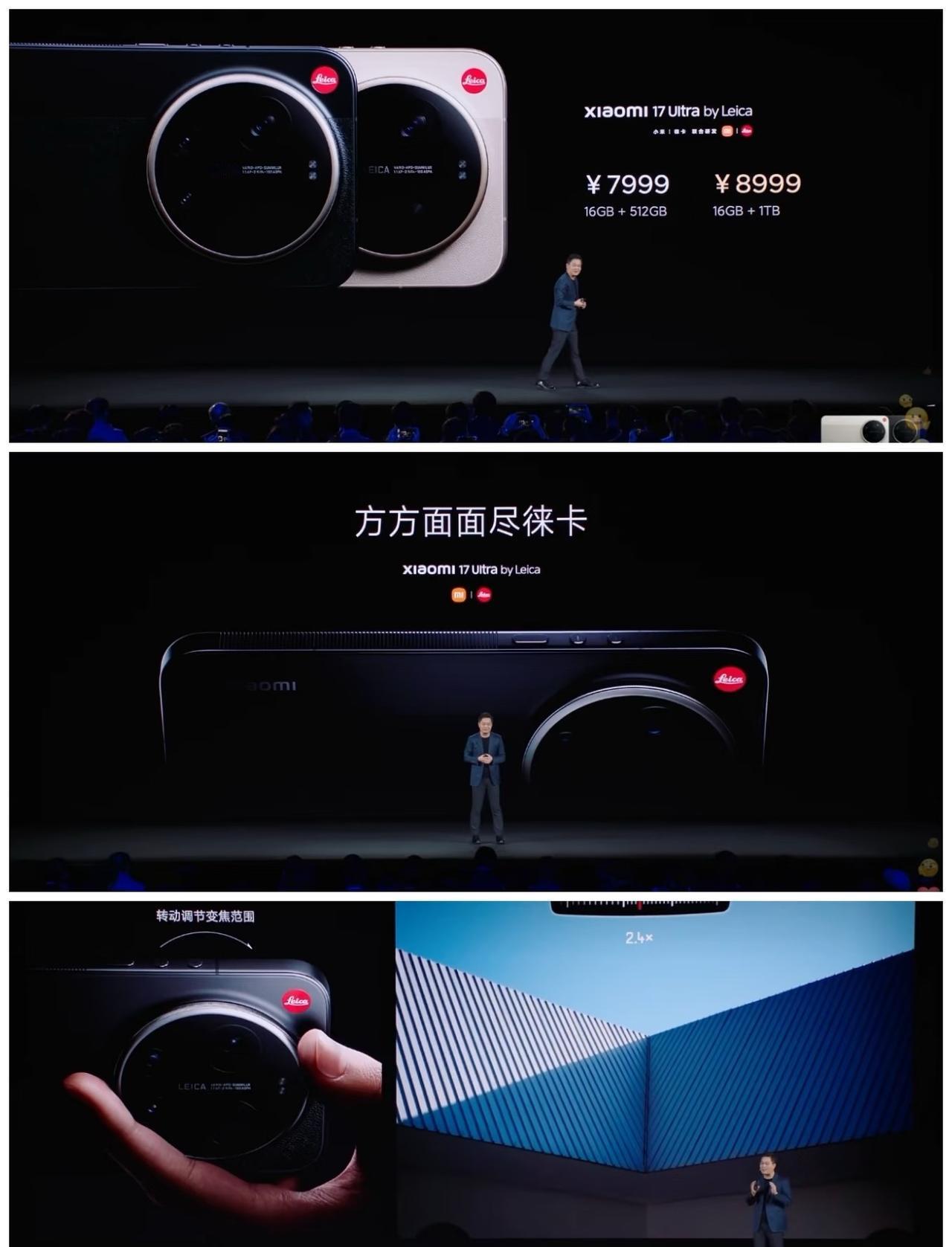 小米17 Ultra价格公布,6999元起售 小米17 Ultra,12GB+512GB售价6999元,16GB+512GB售价7499元,16GB+1TB售价8499元,这个价格符合预期。徕卡版7999元至8999元,加价500元也不贵,主要多了大师变焦环和徕卡红标。 亮点是一英寸超大底主摄,两亿像素连续光学变焦中长焦镜头,6800毫安电池。外围配置挺好的,基本都堆满了,主要卖点还是影像系统,这套硬件配置真的强,只要优化好潜力很大,天花板级别的配置。 还有影像套装,现在价格也还不错。在如今内存涨价的情况下,取消256GB,直接512GB起步,6999元起个人觉得还是不错的。