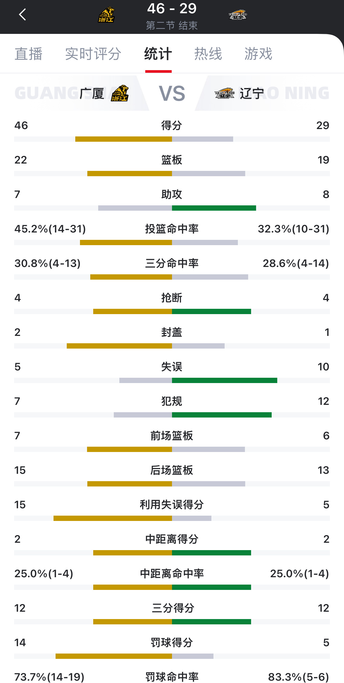 广厦男篮vs辽宁男篮半场比分,广厦46-29领先辽宁,客场是真难打