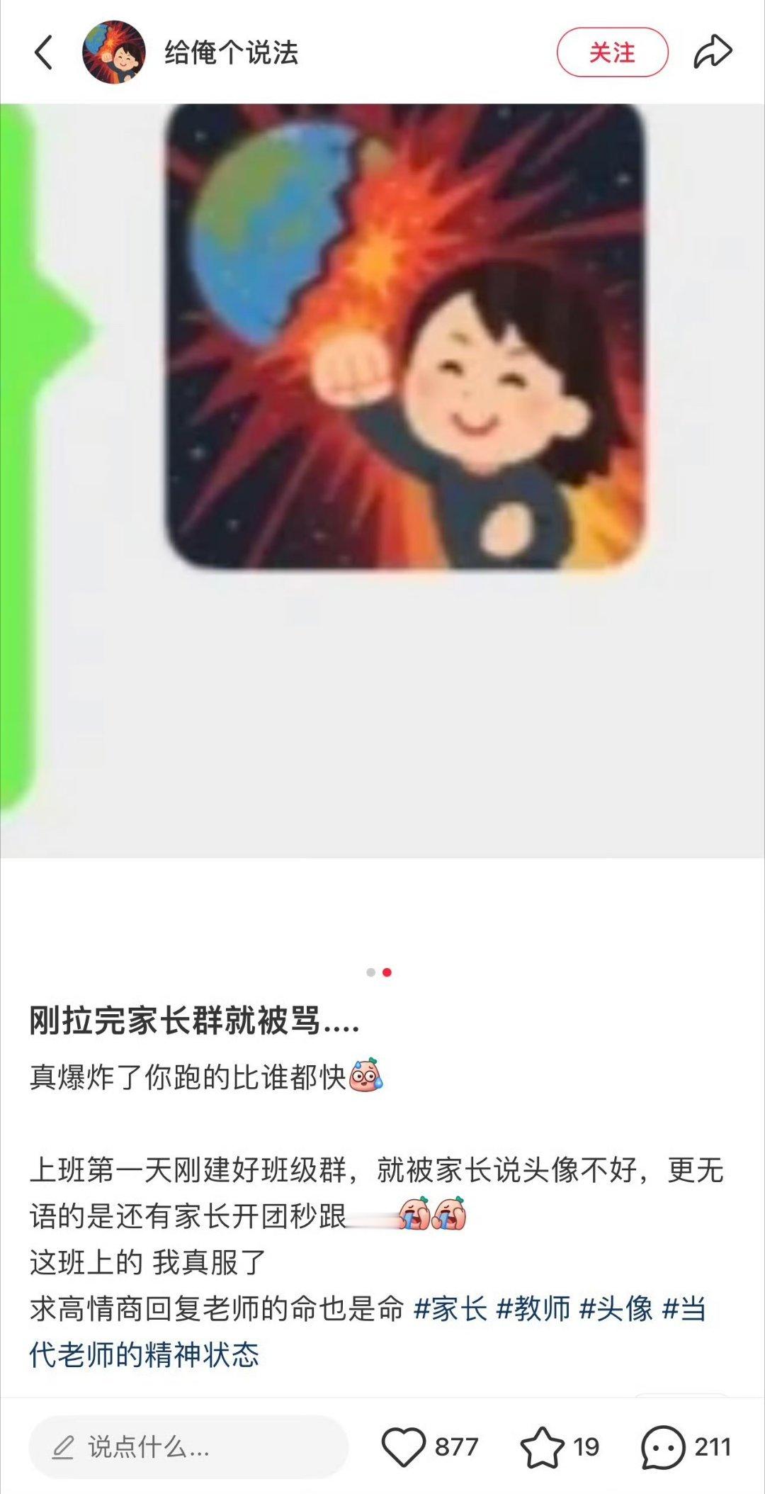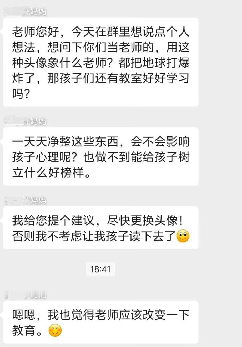 嫌寓意不好浙江一老师被家长要求换头像 ,头像上是一个卡通形象打地球,家长说把地球打爆了,那孩子们还有教室好好学习吗?浙江一老师发贴:刚拉完家长群就被骂....上班第一天刚建好班级群,就被家长说头像不好,更无语的是还有家长开团秒跟.....这班上的 我真服了甚至有家长半夜发给老师信息下最后通牒,要考试换头像