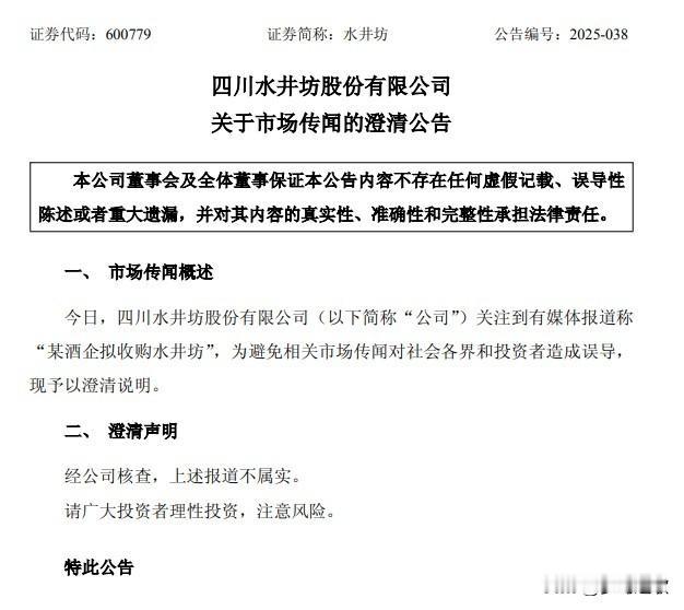 今天涨停的水井坊晚上澄清公告出来,明天要困难了 本来以为白酒板块会在水井坊的带领下至少会反弹一个波段,没想到晚上就来迎头一棒,水井坊澄清了并没有被别的酒企收购的事实,所以今天水井坊的涨停就没有消息面支撑,明天大概率是要跌了。 白酒这波确实是跌的太多了,但是目前看反弹还是无力,至少现在看不到反弹波段,只有零星的消息面干扰。 就看明年的消费政策能否带动白酒的消费了。
