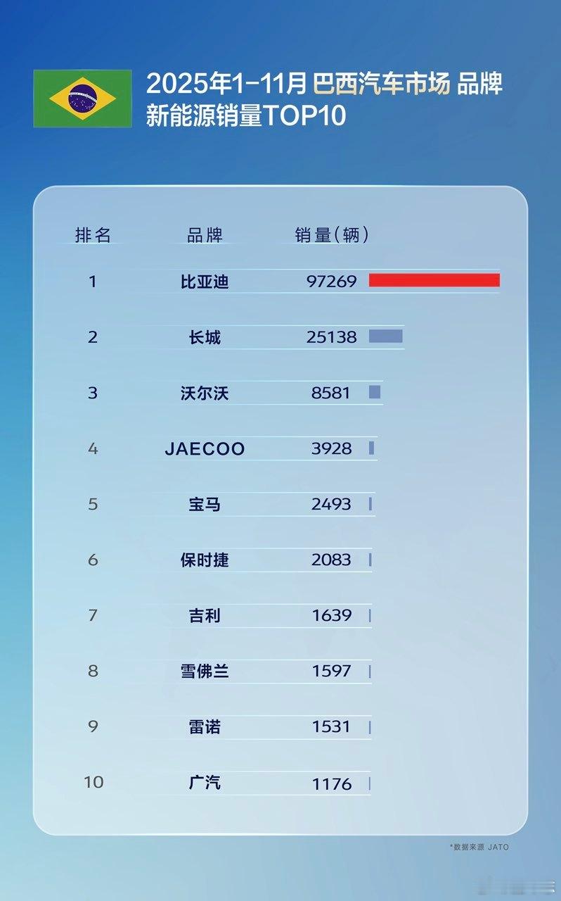 2025 年前 11 个月中国品牌海外销量数据出炉。比亚迪前 11 个月海外销量接近 88 万辆,同比增幅超过 140%,11 月单月出口 12.8 万辆,同比暴涨 300% 以上。在巴西、土耳其、西班牙、意大利等多个市场拿到新能源销量第一,在新加坡、中国香港做到全品牌销冠,并且在英、德、意、西等 11 个核心国家,累计销量已超过特斯拉。奇瑞依然保持中国品牌中最稳定的海外规模输出,上汽在欧洲、拉美持续放量,吉利、长城、长安在不同动力形式和细分市场里不断扩大存在感。更关键的是,这些品牌分布在不同国家、不同价格带、不同政策环境,却同时站上了主流市场的销量榜单。这正是这轮出海最本质的变化。中国汽车第一次不靠低价填补空白,而是把研发、制造、供应链、物流、本地化生产和服务体系整体打包输出,进入并占据全球主流市场的中心位置。