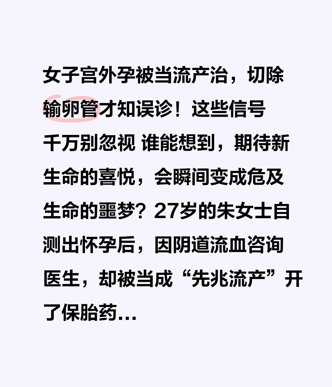 女子宫外孕被当流产治,切除输卵管才知误诊!这些信号千万别忽视 谁能想到,期待新生命的喜悦,会瞬间变成危及生命的噩梦?27岁的朱女士自测出怀孕后,因阴道流血咨询医生,却被当成“先兆流产”开了保胎药,直到腹腔大出血、切除输卵管,才发现竟是宫外孕误诊!这场悲剧,本完全可以避免。 朱女士发现怀孕后,多次到医院检查,医生当时就注明“宫外孕不排除”,可后续她通过微信发送检查单问诊时,主治医生仅凭化验单就草率回复“孕酮低,继续吃保胎药”。哪怕她告知医生“流了血块”,医生也只是轻描淡写说“可能是流产了”,压根没让她到院复查。 转折点发生在一周后,朱女士突然下腹撕裂样剧痛,当场昏厥,被紧急送医时已失血性休克,腹腔积血达1000毫升。手术中,医生发现她左侧输卵管已破裂,只能无奈切除,而这一切的根源,正是被误诊后吃了半个月的保胎药——让宫外孕的孕囊不断膨大,最终撑破了输卵管。 更令人气愤的是,后续调查发现,医生当时甚至把朱女士的检查单和其他患者弄混,连身份都没核实就开了药。法院最终判决医院承担75%的责任,赔偿20余万元,可朱女士失去的输卵管和再次生育的机会,再也回不来了。 其实宫外孕和流产的症状的区别很明显:流产多是先流血后腹痛,痛感是坠胀隐痛;而宫外孕常是一侧下腹先隐痛,破裂后呈撕裂样剧痛,流血多为点滴状深褐色 。更关键的是,宫外孕破裂后的6小时是急救黄金时间,一旦延误就可能丧命。可现实中,像朱女士这样被误诊的案例并不少见,有的医生仅凭血检数值就下结论,忽略了B超未发现孕囊的关键信号。 这场悲剧给所有备孕和已孕女性敲响警钟:怀孕后出现流血、腹痛,千万别盲目保胎,一定要到医院做B超确认孕囊位置;微信问诊只能当参考,绝不能替代线下诊查,毕竟医生没亲自检查,很容易遗漏关键信息;遇到“不排除宫外孕”的提示,一定要按时复查,别抱有侥幸心理。 孕育新生命本是件幸福的事,可医疗疏忽和自身大意,都可能酿成无法挽回的后果。希望朱女士的经历能让更多人重视孕期检查,也希望医疗机构能守住诊疗底线。你身边有人遇到过类似的医疗纠纷吗?
