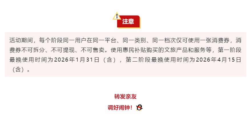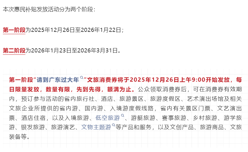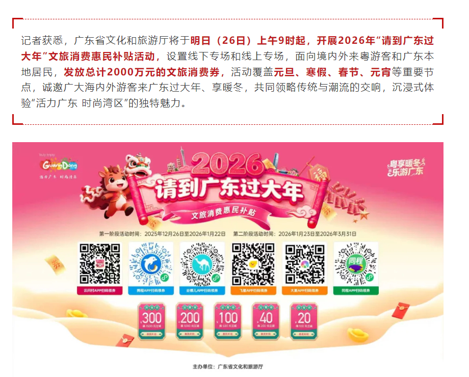 #广东20000000元消费券开抢#【调好闹钟!广东20000000元消费券即将开抢】#2026年请来广东过大年#记者获悉,广东省文化和旅游厅将于明日(26日)上午9时起,开展2026年“请到广东过大年”文旅消费惠民补贴活动,设置线下专场和线上专场,面向境内外来粤游客和广东本地居民,发放总计2000万元的文旅消费券,活动覆盖元旦、寒假、春节、元宵等重要节点,诚邀广大海内外游客来广东过大年、享暖冬,共同领略传统与潮流的交响,沉浸式体验“活力广东 时尚湾区”的独特魅力。