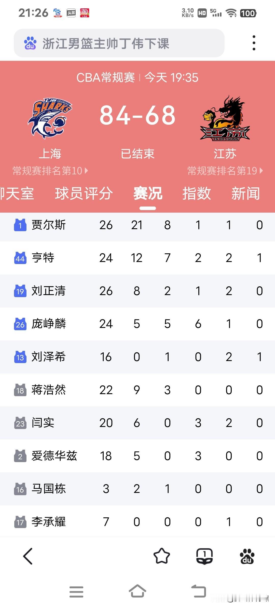 江苏客场68:84惨败上海,一战认清5个人的实力。 1.庞峥麟--绝对值得当作核心来培养,打球拼劲十足,速度快,大局观好,不贪功,基本功扎实,处理球非常沉稳,若有球权绝对成为一名领袖级别的球员。 2.闫实--能力一般,打球太独,眼里只有篮筐,传球意识太差,进攻能力又差。 3.爱德华兹--就没有外援实力,实打实水货, 4.易立(主教练)临场指挥,包括针对性换人,战术体系仍优待提高,最关键的是对外援的使用一头雾水,外援都是单打独斗毫无集体配合战术,谁拿球谁打,国内球员只能陪着跑,也不参与防守,这哪里有什么战术核心,简直就是乱套。