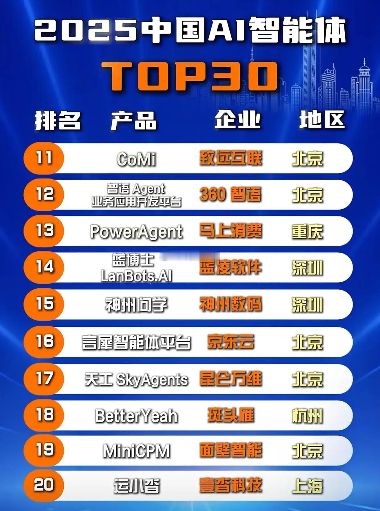 中国AI智能体TOP30出炉,为何北京企业能霸榜?2025中国AI智能体TOP30榜单的发布,揭开了国内AI智能体赛道的竞争格局,而地域分布的差异成为最亮眼的看点——北京企业在榜单中占据绝对主导地位,展现出无可比拟的产业优势。从榜单数据来看,排名第一的扣子Coze来自北京字节跳动,百度Agent Builder、金山办公AI伴写等16家北京企业跻身30强,占比超半数。杭州凭借钉钉AI、阿里巴巴心流等6家企业位列第二,上海以AI-Agentforce、星野等4家企业紧随其后,深圳、重庆、湖州等城市仅有1-3家企业入围,三亚、南京则各有一家企业上榜。北京能成为AI智能体的“创新高地”,既得益于中关村等科创园区的技术积淀,也离不开高校、科研机构的人才供给,以及头部科技企业的资源整合能力。杭州依托阿里、钉钉等企业的生态优势,在办公、产业AI智能体领域形成特色;上海则聚焦于商业化落地场景,深圳凭借硬件与软件结合的优势抢占赛道。值得注意的是,湖州、三亚等非传统科创城市也有企业上榜,说明AI智能体赛道的创新正在向全国扩散。不过,北京在核心技术研发、头部企业集聚上的优势仍难以撼动,未来如何推动区域协同发展,让AI智能体创新成果辐射更多城市,将成为行业发展的关键。