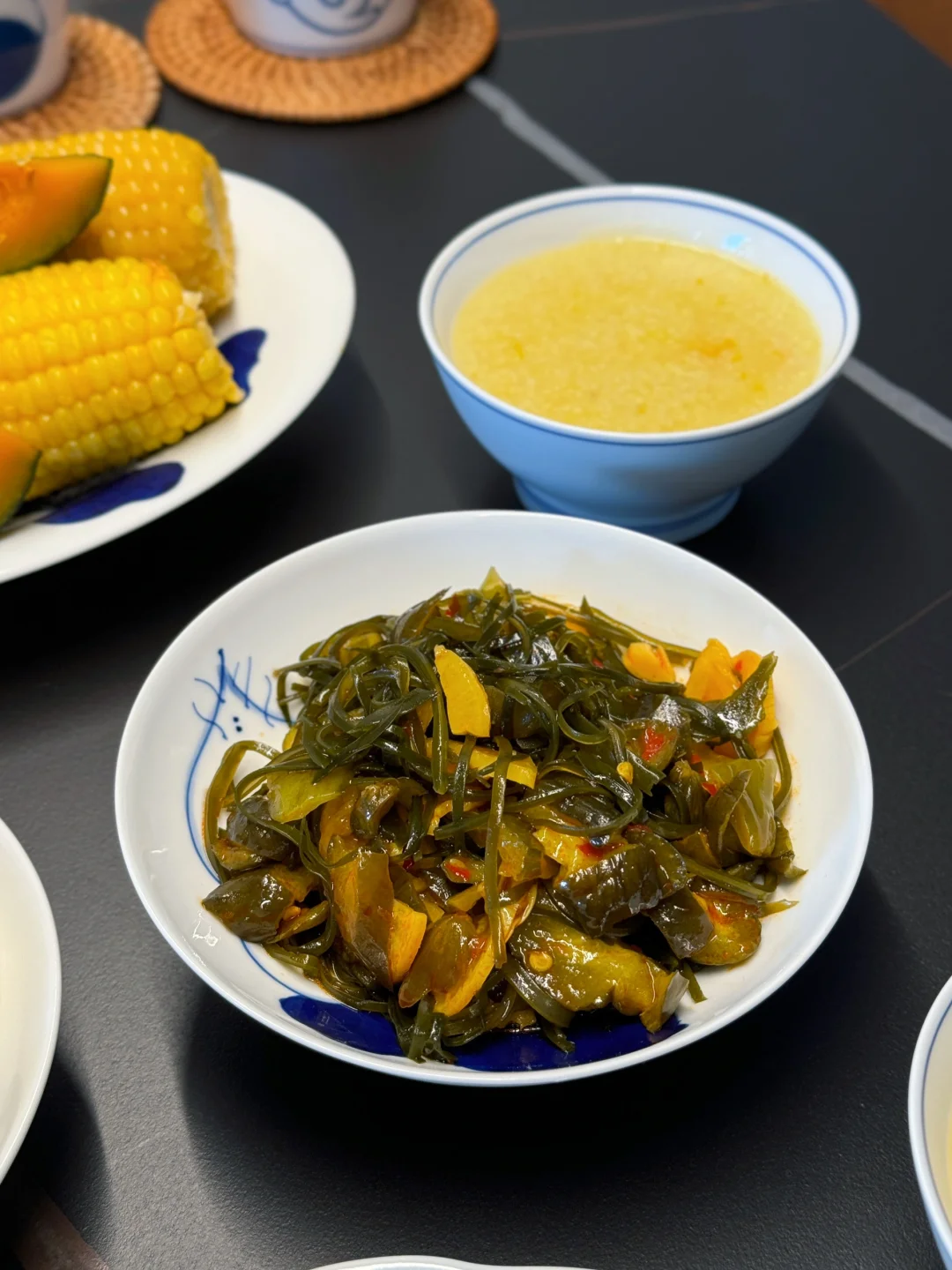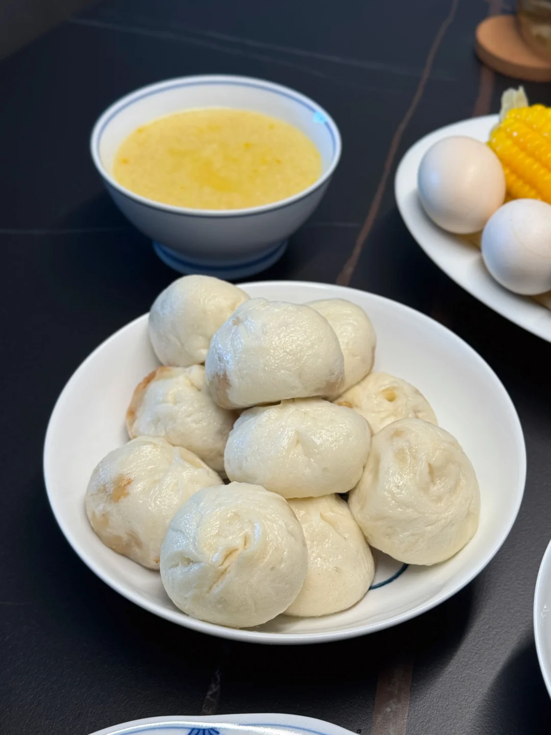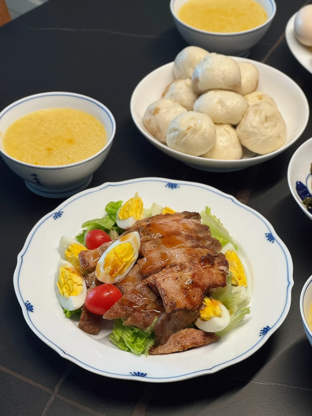 孩子姥姥跟小姨来了 做饭的动力又增加了不少[微笑R] 今天的早餐: 肉包、小米南瓜粥、凉拌海带丝、鸡排沙拉、蒸粗粮