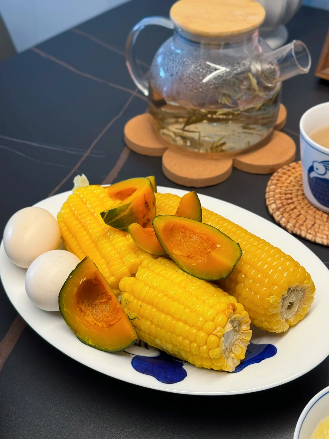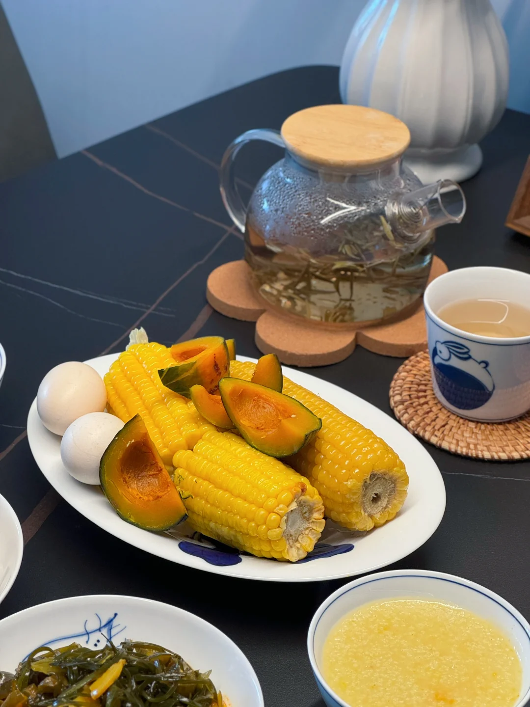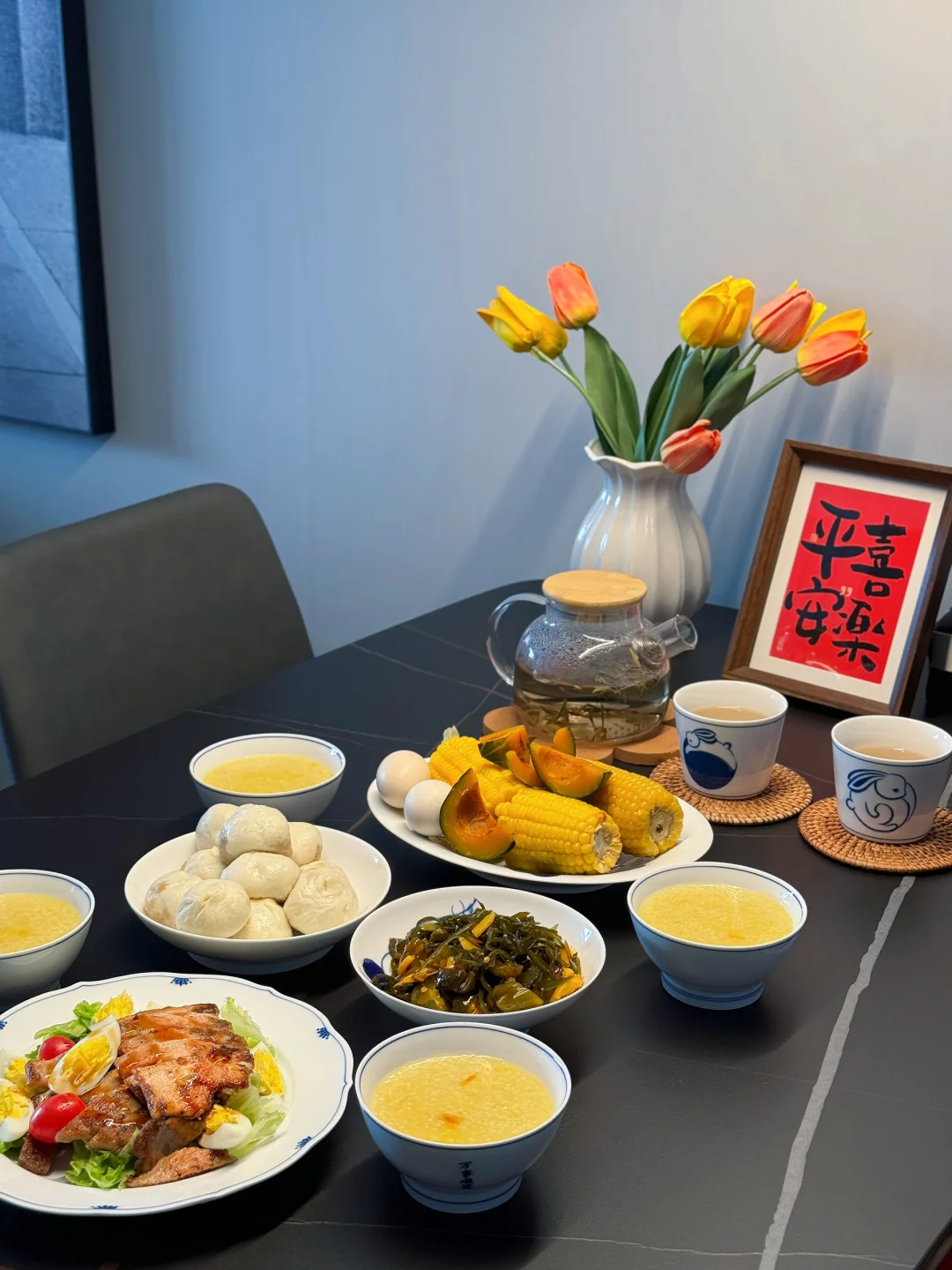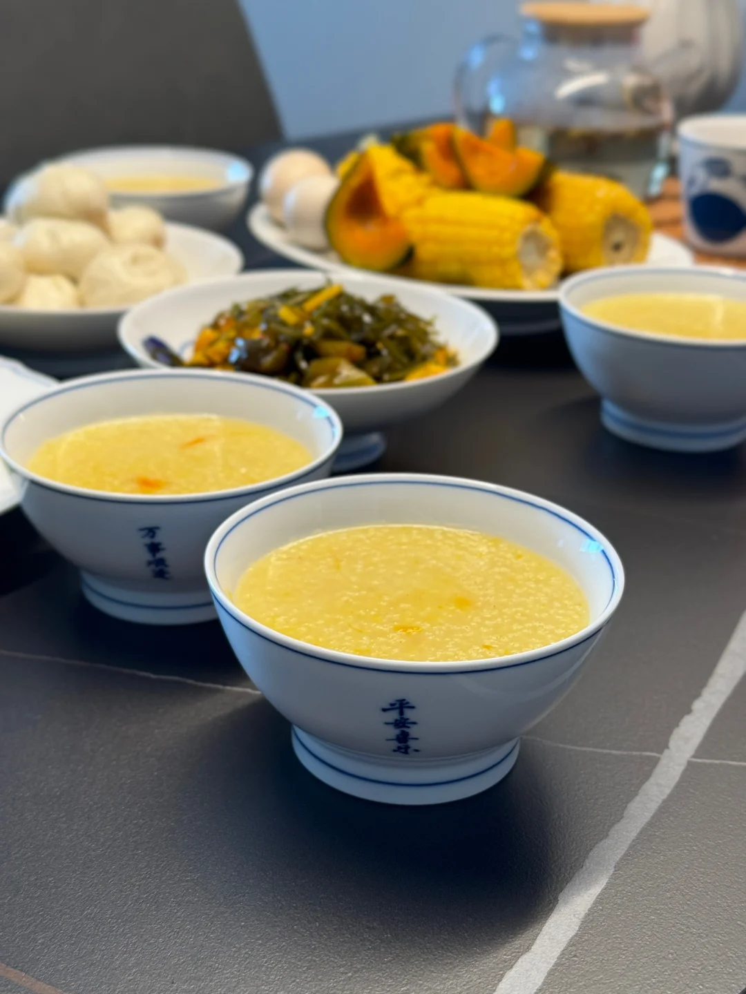 孩子姥姥跟小姨来了 做饭的动力又增加了不少[微笑R] 今天的早餐: 肉包、小米南瓜粥、凉拌海带丝、鸡排沙拉、蒸粗粮