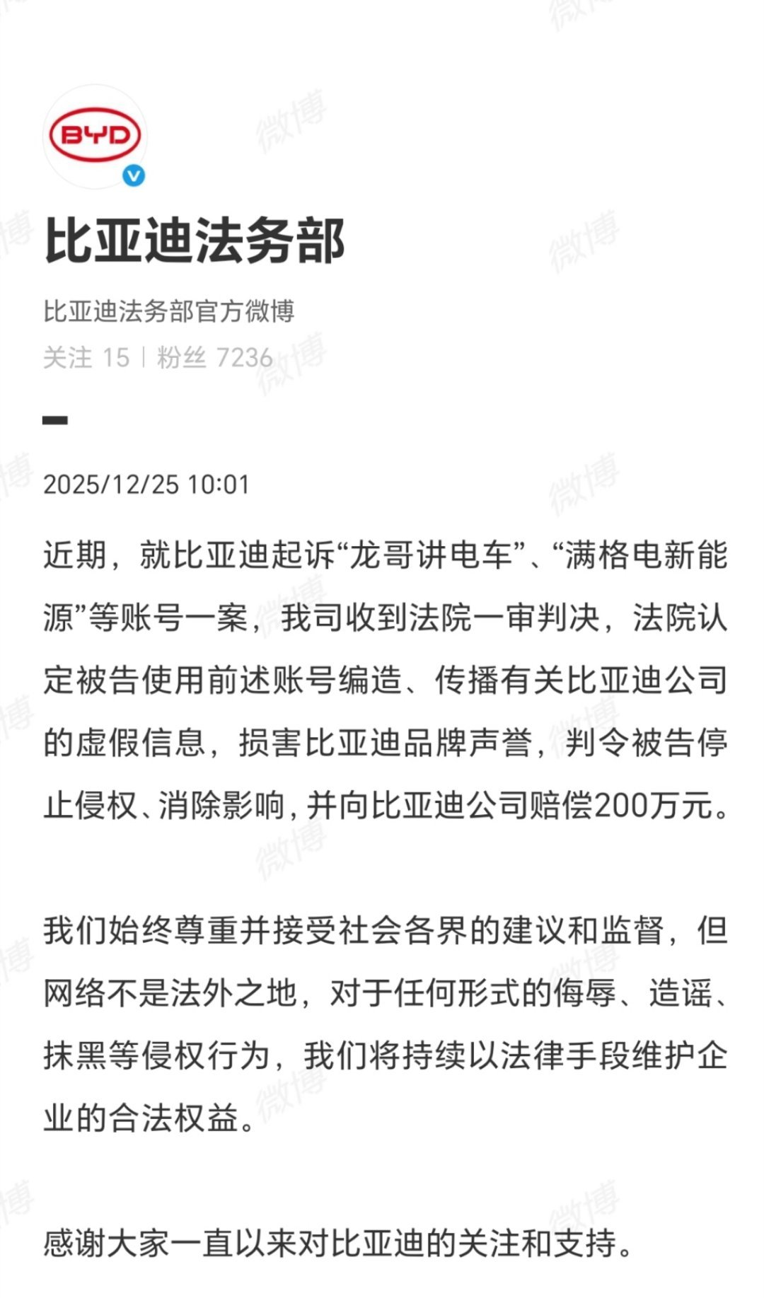 比亚迪起诉造谣账号一审胜诉,被告需停侵权、消影响,赔偿200万元,重申网络不是