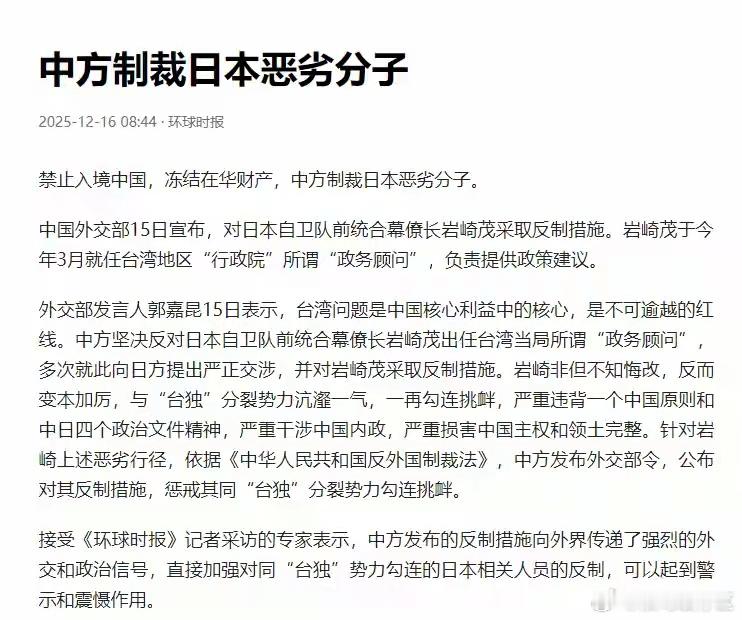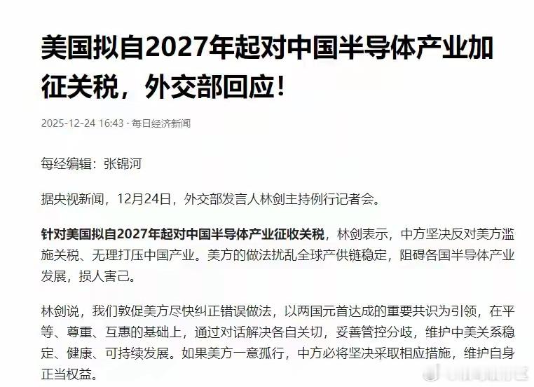 美方介入!喊话中国停止对日本制裁,同时宣布对中国半导体加税中方不再退让,开始制裁日本恶劣分子,冻结其在华资产、禁止其入境。用实际行动来告诉那些图谋不轨之人,“以台制华”是死路一条。而在中方出手没多久后,美国就开始介入。美众议院两党议员提交决议,谴责中方对日本的试压行为。与此同时,美国还打算在2027年起对中国半导体产品加征关税。中美关系刚刚才有向好的迹象,美国为什么又突然对中国发难呢?美国喊话停止对日本制裁自高市早苗上台以后,日本在台湾问题上越来越放肆。高市早苗、小泉进次郎等人一个比一个跳。尤其是小泉进次郎,在高市早苗反复被点名批评和警告后,高市早苗稍微低调了几天,小泉进次郎却越来越过分,先是不断炒作“雷达照射”问题,之后又和美国防长和赫格赛斯通电话,玩起告状的把戏。面对日本的不断挑衅,中方自然也不惯着,多次向日本施压。而为了让日本吸取教训,不要在错误的道路上越走越远。中方在本月15日宣布将对日本自卫队前统合幕僚岩绮茂采取反制措施。具体的反制措施主要有三点,首先是冻结其在中国境内的所有资产,其次是竞争其与我国境内组织或个人有任何合作;最后则是不准岩绮茂入境中国。可能有人会问岩绮茂是谁?为什么中方会对其进行反制?这件事还要追溯到今年3月份,岩绮茂居然冒天下之大不韪担任台湾地区的“政务顾问”。当时中方就对日本发出警告,要求日本政府制止这样恶劣的行为,不要挑衅一个中国原则,更不要对台独势力释放错误的信号。但当时的石破茂政府却表示岩绮茂是退休人员,日本政府不便发布评论。勿谓言之不预也,中方给的台阶不下,中方也不再客气。此次对岩绮茂的制裁,就是在警告其他境外势力,中方绝对不允许外部势力与台独势力相勾结。如果执迷不悟,等待他们的就是严厉的制裁。而除了个人的制裁之外,日本的经济也由于中方的反制损失惨重。尤其是旅游业,在中方官方的呼吁下,许多有赴日旅游打算的人直接退掉了机票。据保守统计,这让日本起码损失了2.2万亿日元的收益。中方的严厉反击,也让日本害怕了。这次是岩绮茂,后续如果小泉进次郎和高市早苗依旧执迷不悟的话,中方的反制也箭在弦上,只会损失得更加惨重。而在日本瑟瑟发抖的时候,美国出手了。日前,美国众议院两党议员提交了决议,谴责中方对日本的施压。这份决议,看上去很唬人,但实际上是美国自娱自乐,没有任何意义。其实在日本挑衅中国问题上,美国早就表明了态度,那就是不过度参与。在中方反复批评警告高市早苗政府时,美国一直保持着沉默,让高市早苗政府独自承担压力。日本驻美国大使还曾表示对于美国的沉默感到沮丧,就足以看出美国压根没想管这件事。而这也是美国的常规操作,一边想着遏制中国的发展,但又不愿意和中方正面对抗,所以总会忽悠一些小弟去做这些事。但每次事发后,美国要么保持沉默,要么就是给予言语支持,其他什么都不会做。因为美国也怕引火烧身,所以在一边拱火的同时,又一边保持着距离。这次美国众议院提交的决议,对日本来说更多是心理慰藉,根本阻挡不了中方反制这些恶劣分子的决心。其实美国不应该多管闲事,应该好好专注于自身。不要再做出损害中美关系的事情来,像最近,美国又拟对中国半导体加征关税。美国拟对中国半导体加征关税12月23日,美国贸易代表办公室发布了一则针对中国半导体产业的声明,表示将在2027年6月对中国半导体加征关税。美国还给出理由,表示中国在半导体的地位是“不合理”的,对美国造成了“负担和限制”。过去,美国总是在半导体等高新科技领域打压中国,不愿意看到中国在半导体等高新领域取得成绩。在半导体领域面对美国的打压和封锁,中国没有妥协和投降,而是奋起直追。在看到中国不断取得成绩后,美国自然也就慌了。据美国估计,等到中国半导体领域彻底成熟后,很有可能占据全球一半的市场,这也是美国表示造成了“负担和限制”的原因。而为了防止这种情况发生,美国就开始提前做准备,所以想出来这个损招。这种行为,其实跟“只许州官放火”差不多,是非常错误的。中国此前又不是没有想过一起合作,但奈何美西方不讲理,所以中方只能自己发展了。现如今好不容易做出一点成绩,却又开始使用一些旁门左道的邪招。中方维护自身利益的决心一向都是非常坚决的,在美国放声要对中国半导体下手后,外交部发言人也第一时间进行了回应。外交部发言人在讲话中提到:如果美国一意孤行,中方必将采取措施来维护自身的权益。在特朗普对中国加征关税的时候,中方的反制来的就非常快。最终,美国也受损惨重,同样的招数再出一次,结果肯定也是一样。而且,中方还有很多底牌没出,像稀土牌,一旦打出,美国肯定是经受不起的。所以希望美国停止试压,及时回头。总结中方反复强调合作共赢并不是空话,美国出阴招,只会伤敌八百、自损一千。历史其实造已经告诉了美国,中国的崛起是必然的,无论美国耍什么花招,动用什么样的手段,都不能阻挡中国崛起的步伐。与其总是去做一些损人不利己的事情,不如正视中方的发展。