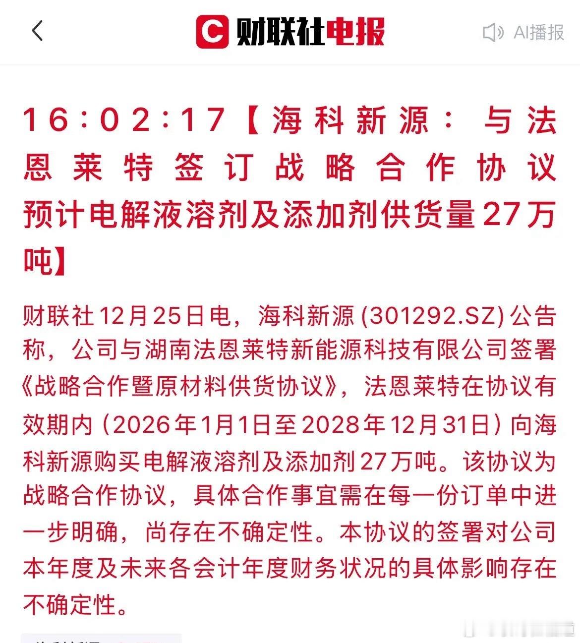 重磅利好!“海科新源”再获电解液材料大单,提前锁定未来三年出货27万吨!盘后,海科新源发布公告称:与法恩莱特签订战略协议,2026至2028年将供应电解液溶剂及添加剂高达27万吨。巨头为何争相锁定货源?核心在于:· 短期景气催化:电解液核心添加剂(如VC)近期因供给紧张价格快速上涨,公司相关产品直接受益。·长期需求锁定:这是公司两个月内公布的第三份长单,提前锁定的潜在订单已超100万吨,进一步巩固市场龙头地位。· 行业拐点确认:电解液溶剂价格在经历长期低迷后已进入普涨通道,行业景气度正全面回暖。此份协议进一步强化了公司的长期成长逻辑,为其未来业绩提供了坚实基础。