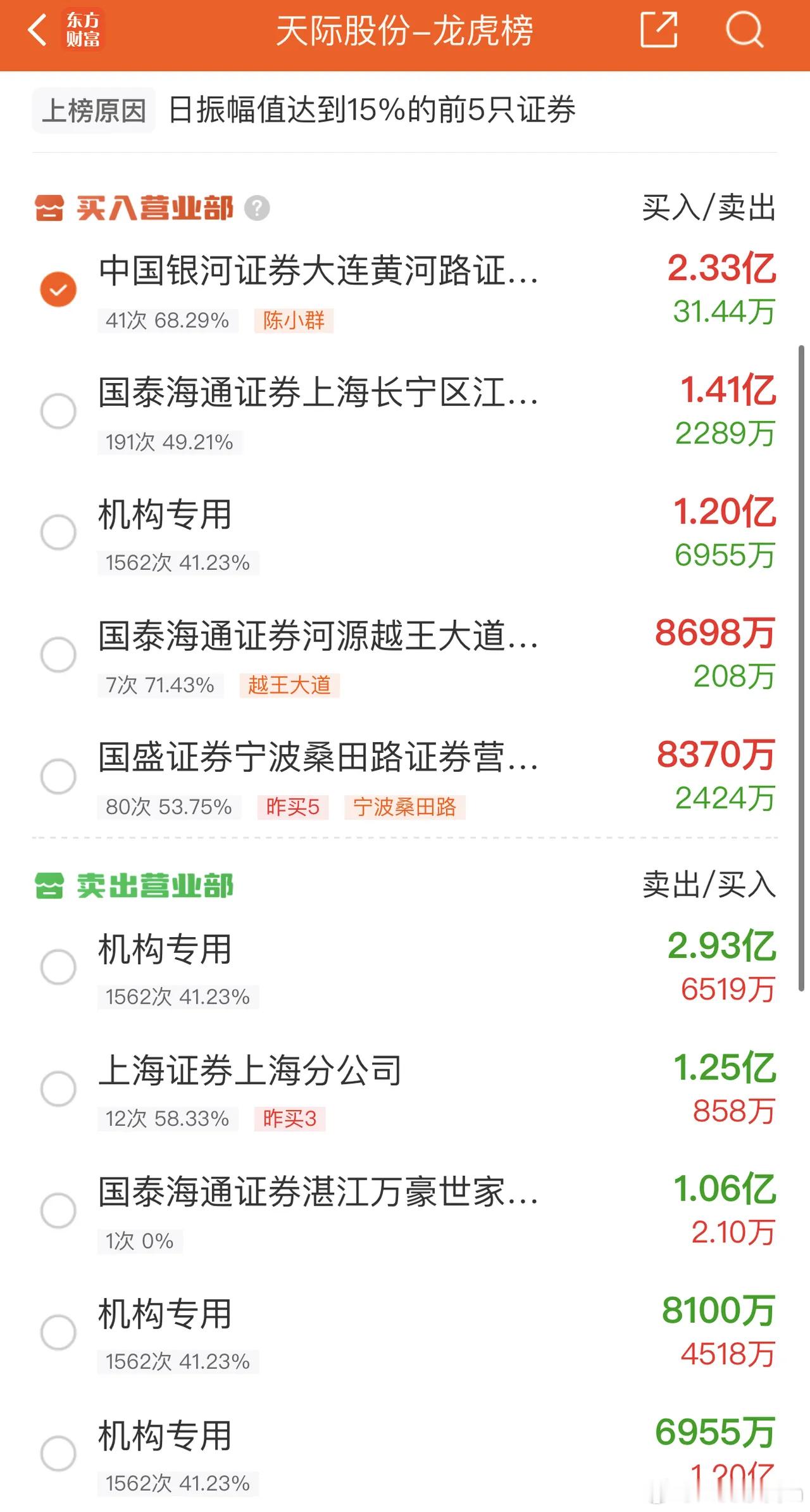 2025年12月25日,陈小群大买2.33亿,各大股吧前十热股:淘股吧: 1.神剑股份 2.航天发展 3.再升科技 4.创元科技 5.锋龙股份 6.胜通能源 7.中国卫星 8.嘉美包装 9.隆基机械 10.九鼎新材东财吧: 1.中国卫星 2.锋龙股份 3.航天发展 4.航天电子 5.神剑股份 6.东百集团 7.海南发展 8.再升科技 9.昊志机电 10.航天动力同花顺: 1.航天发展 2.中国卫星 3.天际股份 4.锋龙股份 5.东百集团 6.神剑股份 7.西部材料 8.平潭发展 9.航天电子 10.百大集团 市场放量442.5亿,全天成交额达到了19245.2亿。上涨家数3773家,下跌家数1473家,涨停家数96家,跌停家数2家。 今天北向资金休息,指数还能放量大涨,距离4000点又近一步了。大盘指数已经7连阳了,今天商业航天延续强势,连续逼空,机器人也挺强的,有分庭抗礼的意思。接下来剩四个交易日了,大有一副跨年行情开启的感觉。今天大消费有所跳水,安记食品和东百集团均冲高回落收绿,收盘一看龙虎榜,超预期的是陈小群还没走,真能格局,应该是真的看好大消费。 5大方向就是大科技,大消费,固态电池,商业航天和机器人,有叠加属性的更优。圣诞快乐,随手点赞,月入百万。