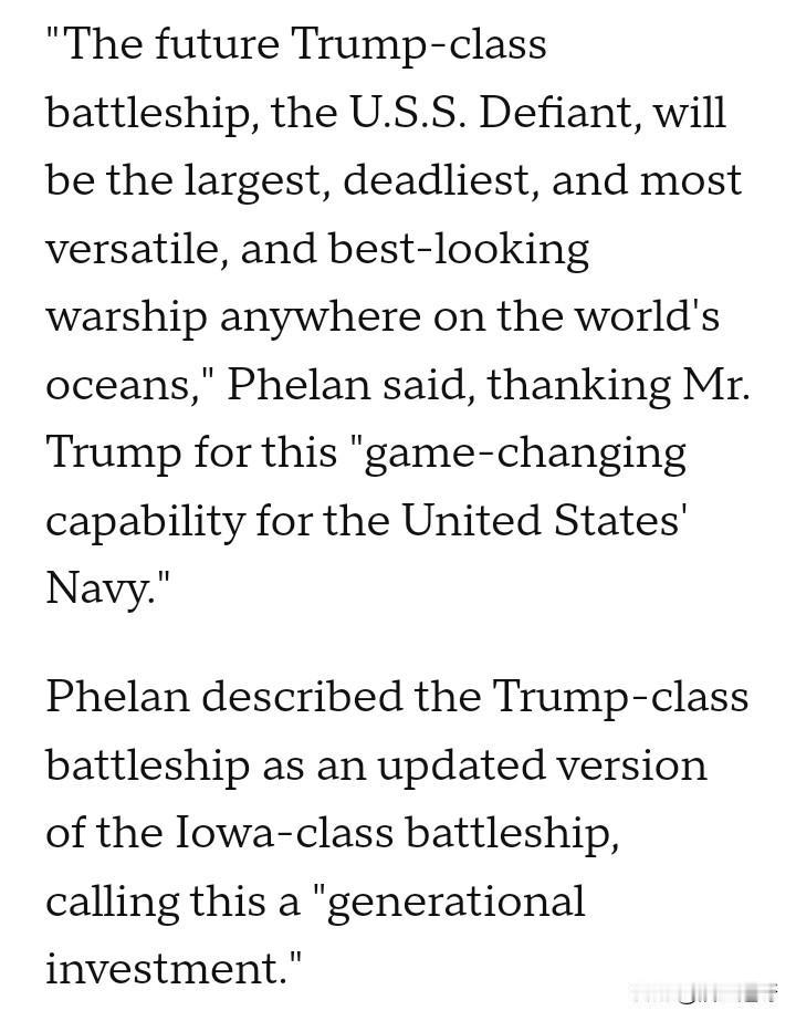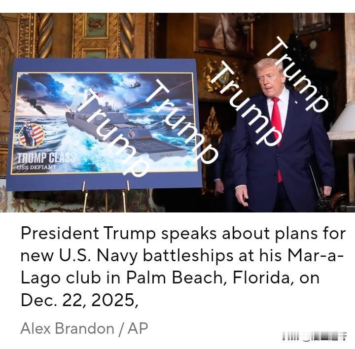 这两天有点偷懒了。继续😉 川普宣布:计划建造一支世界上最大、最强的美国海军战舰舰队,并且要命名为“川普级”,由美国海军出资买下来,然后组建成“黄金舰队”。 🤔 老川的心思到底在想啥?