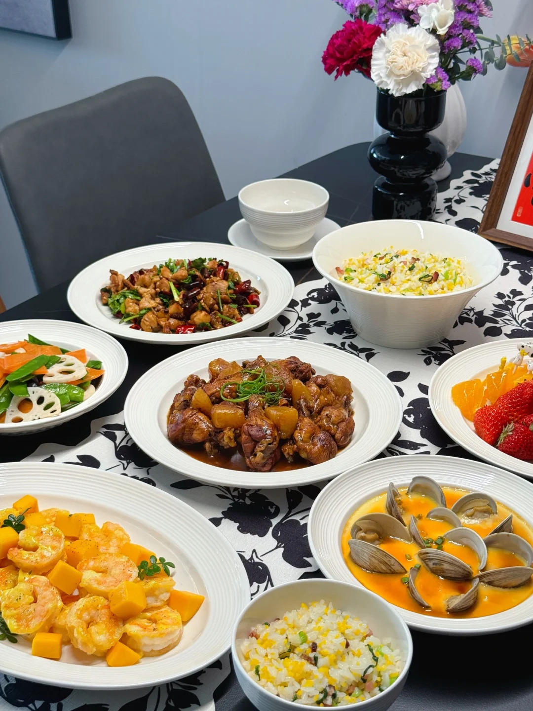 中年妇女,买菜也买花!买菜是安顿生活,买花抚慰心灵[玫瑰R] 分享今日家常菜: 🥢芥末虾仁 🥢红烧鸡腿土豆 🥢腊肉菜炒饭 🥢蛤蜊蒸蛋 🥢荷塘小炒 🥢辣子鸡丁 🥢水果:橙子、草莓