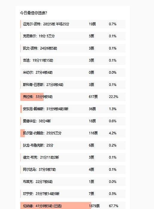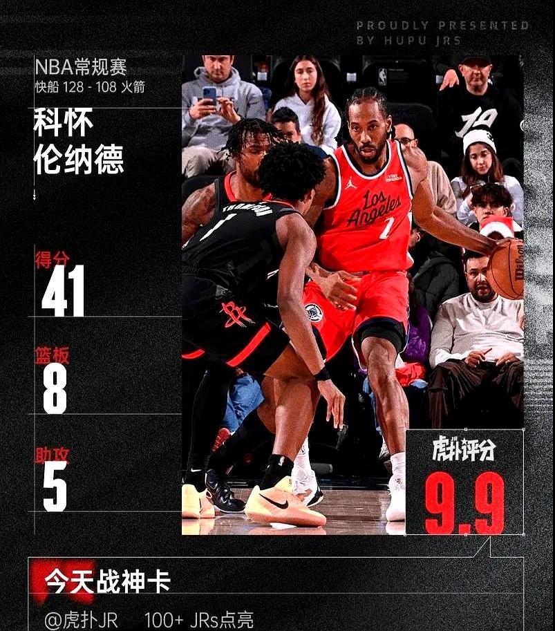 昨晚NBA数据大爆炸,为啥最佳偏偏给了小卡? 2025年12月23日,快船主场128-108干脆利落地赢了火箭20分。小卡伦纳德简直是天神下凡,23投16中,轰下赛季新高41分8篮板5助攻,真实命中率超过80%! 对面杜兰特被他防得只拿22分,火箭全队三分30中9,第四节早早就没心气儿了。这攻防一体的统治力,直接把比赛打花了。 同一晚,其他人也很猛。唐斯空砍40分13板,新秀库珀-弗拉格也打出33+9+9的准三双,帮独行侠131-130险胜掘金,和东契奇并列成了历史唯二打出这数据的19岁小伙。 可大家看完,还是觉得小卡那场最硬。唐斯数据好,但带队的是爱德华兹。弗拉格是牛,未来可期,但昨晚,昨晚的风头还是被抢了。 说白了,最佳球员看的不是谁分数最高,是看谁能用最狠的方式终结比赛。小卡不声不响,就用历史级的效率和防守,带队拿到连胜。 数据好看的人太多,但能这样统治攻防两端的,昨晚就他一个。