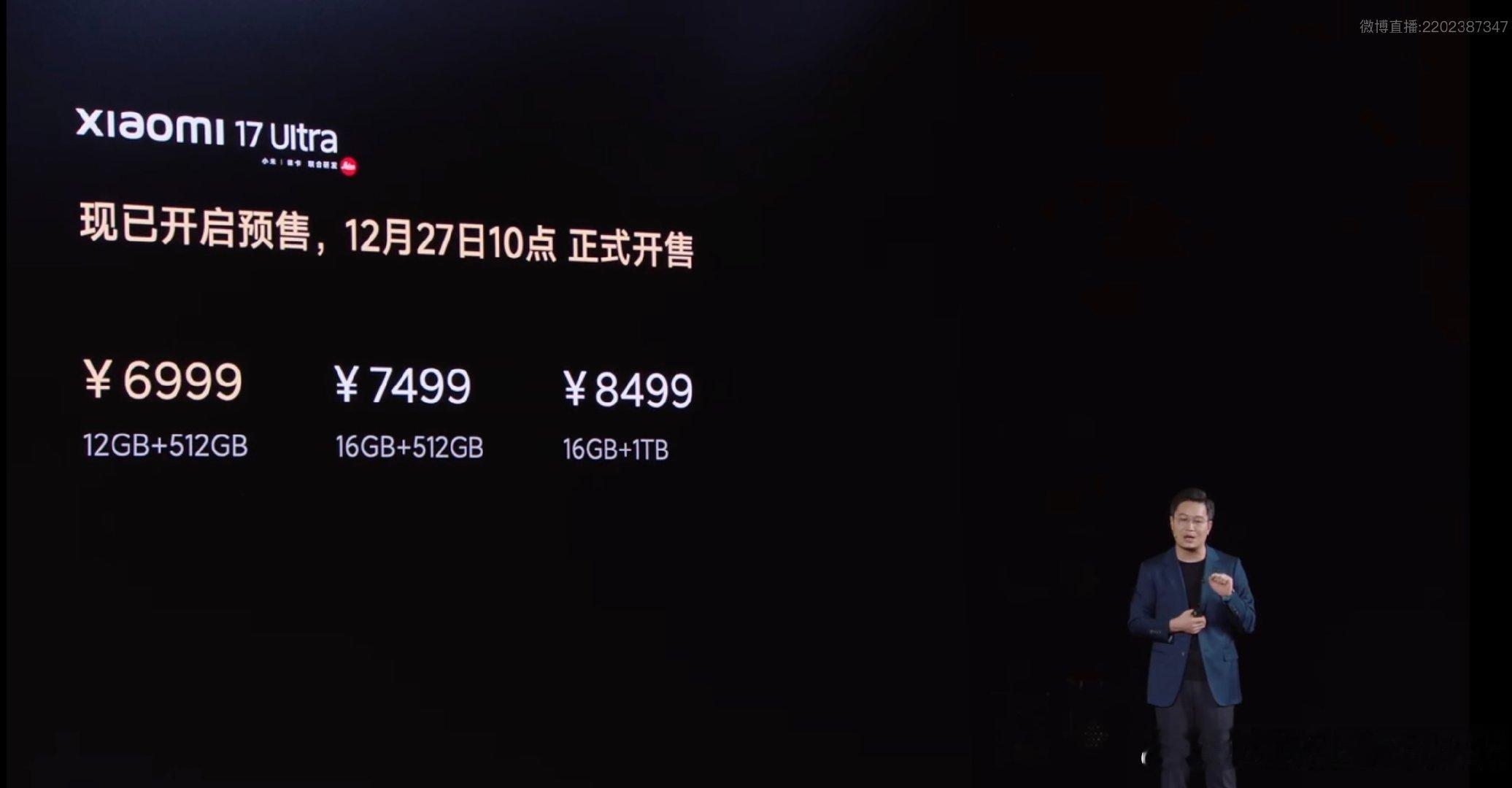 【小米17Ultra售价6999元起】12月25日,小米17 Ultra 发布,售价如下:12GB+512GB 6999元16GB+512GB 7499元16GB+1TB 8499元