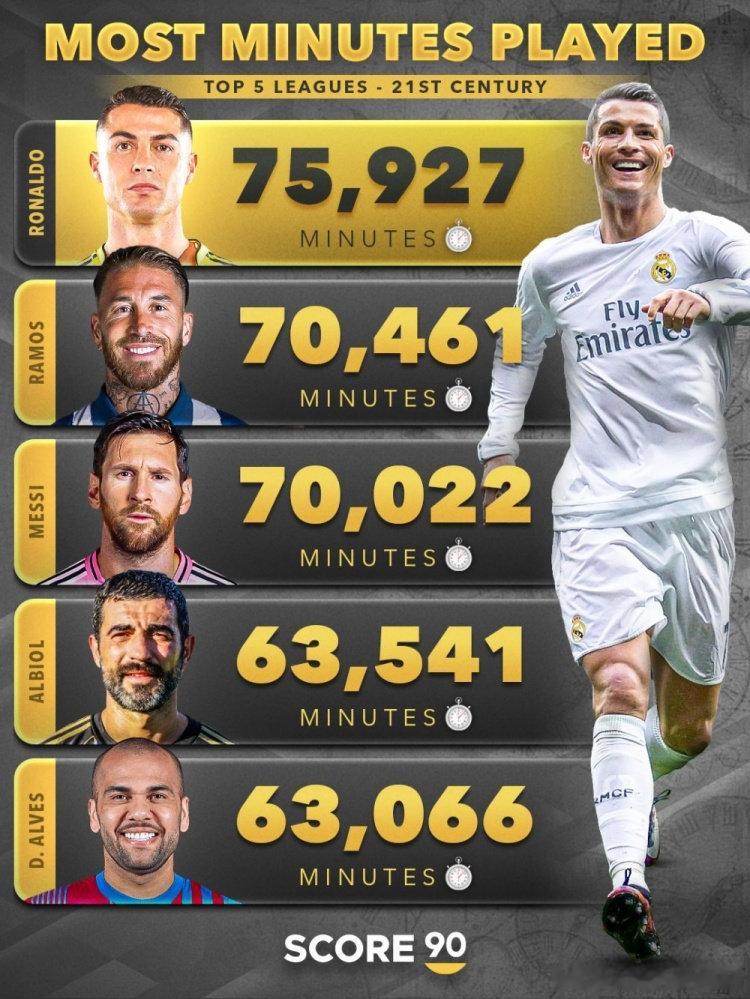 【21世纪五大联赛出场时间排名,C罗21世纪五大联赛出场时间居首】12月25日讯 C罗和梅西是世界足坛的绝代双骄,他们收割的奖杯和进球不计其数。这同时要得益于他们超长的足球生涯。据Score90数据统计,在21世纪欧洲五大联赛中,C罗出场时间75927分钟居首,而梅西70022分钟排名第三。(直播吧)以下是21世纪欧洲五大联赛出场时间前十榜单:① C罗 75927分钟② 拉莫斯 70461分钟③ 梅西 70022分钟④ 阿尔比奥尔 63541分钟⑤ 阿尔维斯 63066分钟⑥ 加雷斯·巴里 61860分钟⑦ 特里 611020分钟⑧ 阿斯皮利奎塔 60934分钟⑨ 兰帕德 59737分钟⑩ 莱万 58579分钟