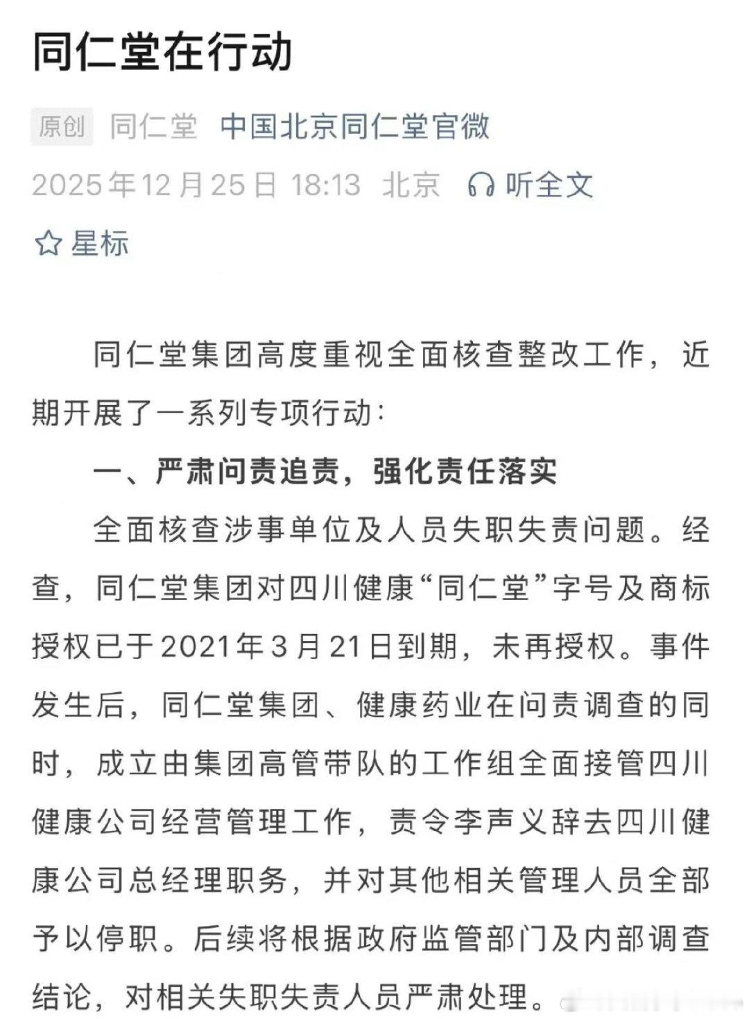 【同仁堂整改行动】12月25日,中国北京同仁堂(集团)有限责任公司发文表示,同仁堂集团高度重视全面核查整改工作,近期开展了一系列专项行动:一、严肃问责追责,强化责任落实全面核查涉事单位及人员失职失责问题。经查,同仁堂集团对四川健康“同仁堂”字号及商标授权已于2021年3月21日到期,未再授权。事件发生后,同仁堂集团、健康药业在问责调查的同时,成立由集团高管带队的工作组全面接管四川健康公司经营管理工作,责令李声义辞去四川健康公司总经理职务,并对其他相关管理人员全部予以停职。后续将根据政府监管部门及内部调查结论,对相关失职失责人员严肃处理。二、全力配合监管,推进调查处置同仁堂集团驻四川工作组主动对接,积极配合四川省、成都市、新都区三级联合调查组的立案调查工作,已提交了四川健康侵权行为相关佐证文件。同仁堂集团持续推动四川健康产品下架、召回涉事产品,向各大电商平台发声明函每日监测并推动联动清理,阻断涉事产品流通渠道三、公布正规产品信息查询系统,引导消费者认准“同仁堂”双龙标针对消费者反映的产品辨伪问题郑重提示正规“同仁堂”品牌产品,清晰印制“双龙标”,商标也作为官方授权店铺的统一标识;12月23日同仁堂集团产品查询系统已在官网上线,开放1000余条涵盖中成药、保健食品等品类产品的信息查询服务,提供权威购买指引。四、开展品牌严管专项行动,全面清理违规乱象同仁堂集团已启动品牌严管专项行动,对各级企业品牌使用情况开展拉网式核查,截至12月24日,与累计排查所属单位/店铺520余次。自品牌严管专项行动以来,对重点电商平台上侵权产品和店铺链接进行排查,累计完成侵权产品投诉近600项;对“同仁堂正品直售”“北京同仁堂滋补佳品”等120余个冒用同仁堂名义的违规店铺发起投诉,坚决打击“擦边”使用“同仁堂”字号、商标使用不规范等行为。此前,据媒体报道,一款标称“北京同仁堂99%高纯南极磷虾油”的产品,磷脂标识值为43%,实测为0。市场监管总局12月25日回应“南极磷虾油”事件暴露出企业委托生产加工行为不规范等问题。一些企业借助企业品牌影响力,仅关注销售利润却不对产品质量进行把关,甚至纵容被委托企业制售不合格产品。