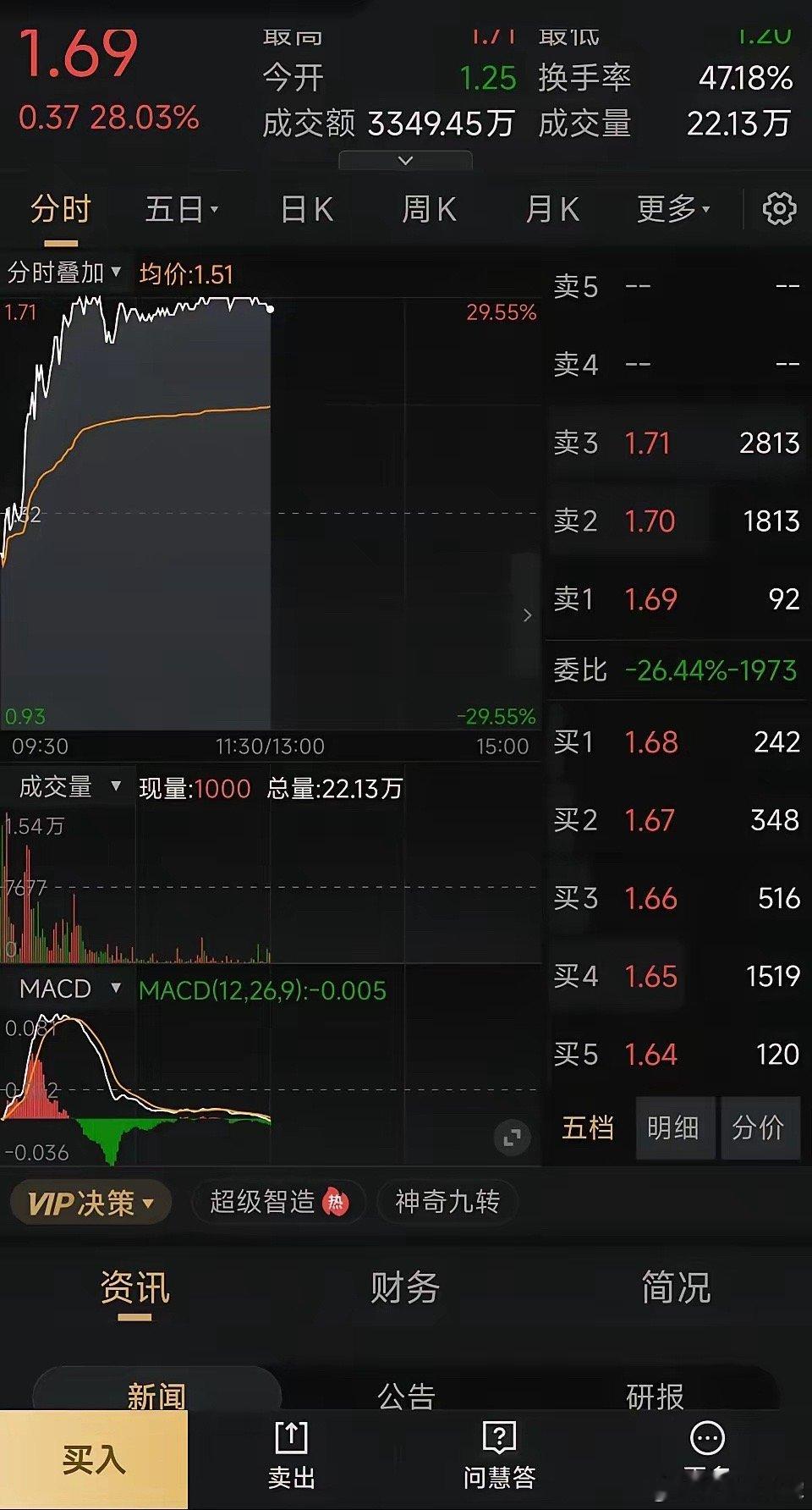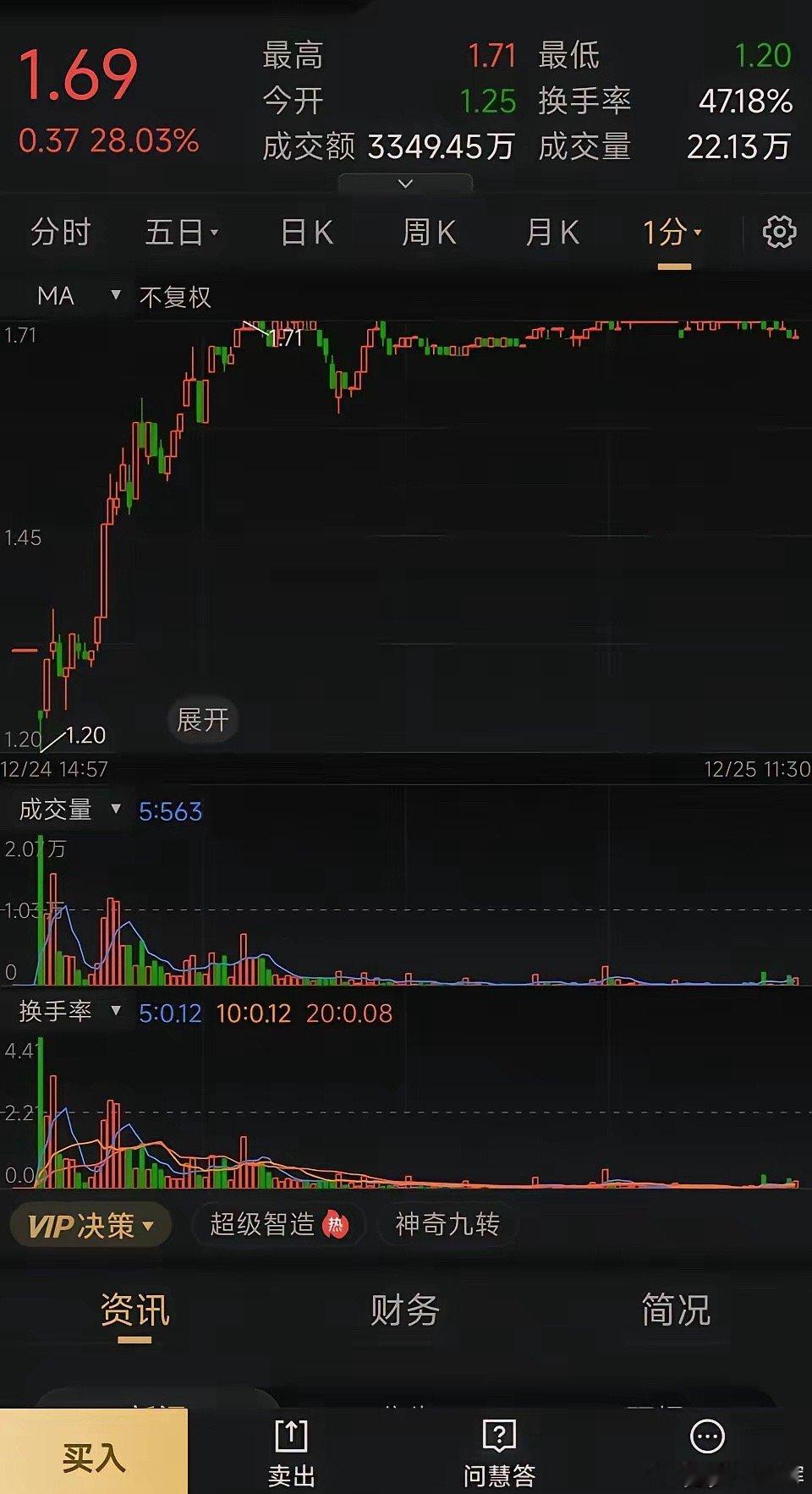 从昨天的0.93元涨到今天的1.71元,二天涨幅高达83.87%,这就是退市股最后的疯狂!真没想到一个即将退市的造假票也能玩得这么疯狂,下面来看看它这两天是如何疯狂到底的!昨天早盘以0.99元低开,开盘后仅一分钟就下探至0.93元,9:45分时开始拉升,10分钟后由绿转红,10:15分时票价已经涨到了1.28元,但是直到下午13:47分时才触及涨停价1.32元,并且在13:52分时成功封板,虽然在14:16分涨停板被打开,但是14:25分时再度回封至收盘。这一天累计成交额达到了2494.31万元,换手率也达到了46.41%。今天的走势跟昨天有点相似,同样的低开高走,但是感觉今天比昨天强势,因为在上午10点过后就触及涨停板了!今天以1.25元开盘下跌5.3%,开盘后下探至1.20元被拉起,随后被快速拉升,10:02分时触及涨停板,但是并没有封板,10:17分回落至1.60元,11:03分再次成功封板,11:11分再次开板,开板之后就没再封板了,截止上午收盘价报1.69元上涨28.03%,换手率达到了47.18%,成交额也有3349.45万元。从昨天低点的0.93元到今天的1.71元,两天时间的涨幅就高达83.87%,它用两天时间走完了别人一年都可能走不完的路程。对于一只即将退市的票,它正在用仅剩下的五个交易日做最后的挣扎,但是无论它现在怎么努力也改变不了12月31日被退市的命运,大家接下来继续看它表演就行了。话说回来,这样的票在座的各位有没有敢参与的?
