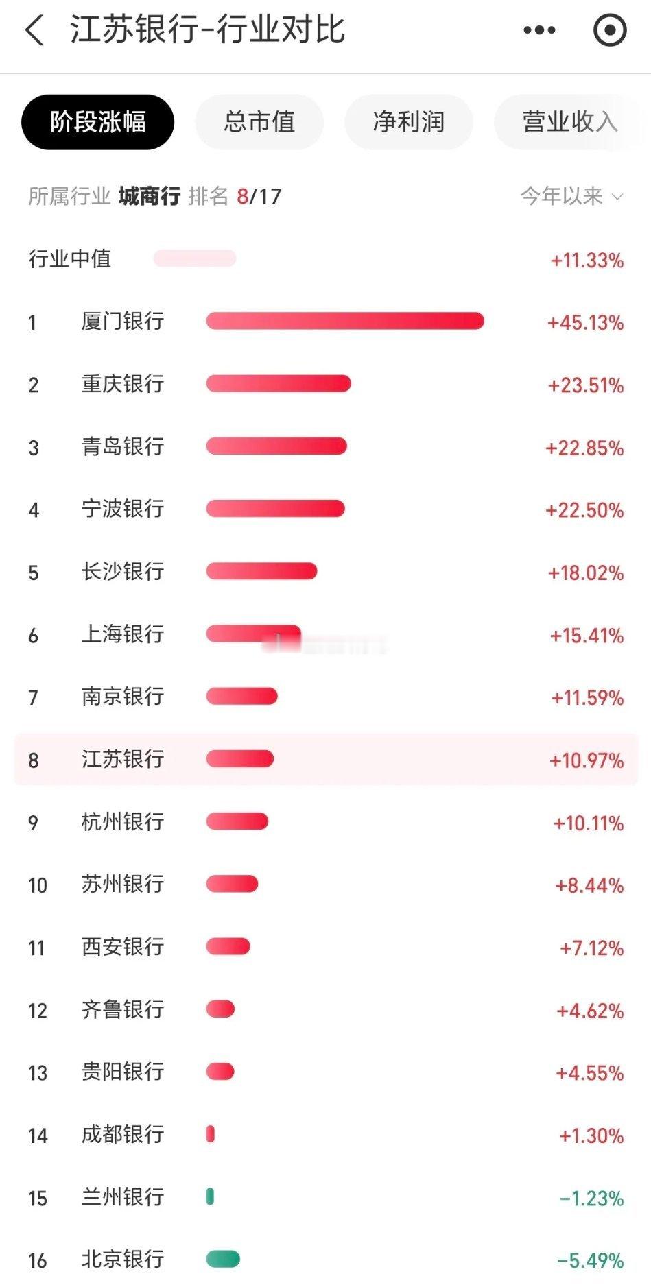 江苏银行最近被讨论的比较多,大多数是比较悲观的,股价一直震荡走低,年线也没守住,相当于一年白干。但你要是长期持有的,今年江苏银行的涨幅接近11个点,在城商行中居中,还是能跑赢大多数的人。目前动态市盈率5.56,排名在13位,估值明显低。中期分红按去年,应该快要公布了。这个位置没必要过分悲观了,股息接近5个点,价值投资者本身就是少数人,就需要屏蔽外界的干扰!