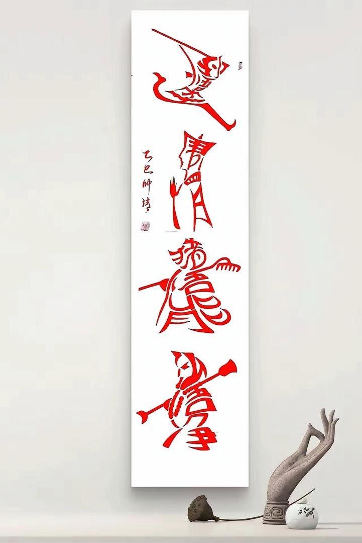 友友们,求助一下! 头条藏龙卧虎之地! 请问,这是什么字体啊? 怎么跟一幅画一样? 实在是太漂亮了! 网上查了一下字体属于鸟虫篆? 也不知道是否正确? 画的还是唐僧和他的三个徒弟, 这个到底是什么字呢? 能认出来的绝对是一位书法方面的高手。 烦请,书法大师指点迷津! 在下有礼了![作揖][作揖][作揖] 篆体字