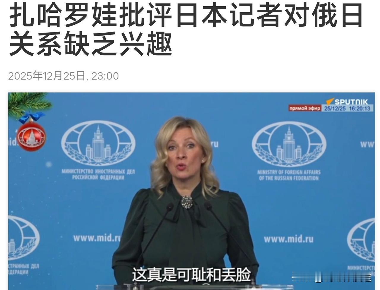 四级“祖国功勋"获得者 俄罗斯扎哈罗娃将“炮口”指向日本记者:不知道这些日本记者在俄罗斯干什么,既然不报道日俄关系,那来莫斯科干什么呢? 这是俄罗斯外交部发言人扎哈罗娃在记者会上针对日本记者不正确或根本就不报道日俄关系的新闻而表达出质疑。 12 月 24 日 普京向扎哈罗娃颁发四级“祖国功勋”的勋章,并被称之为“俄罗斯之声”的扎哈罗娃,一直都日本政府 完全没有将日俄关系视为重点,而对于日本记者在俄罗斯报道的新闻严格审查,审查的目的就是不能让正能量公平公正的新闻在日本国内传播,反之俄罗斯负面的新闻正成为日本重点播放的新闻,这正日本政府所期待抵毁俄罗斯所需要的素材。 扎哈罗娃毫不客气的将日本记者在俄罗斯的作为直接指向日本政府,正是日本政府禁止就俄日关系的新闻审查及传递,让日本记者在俄罗斯无所事事,由此扎哈罗娃才表示,作为一个日本记者来到莫斯科如果不报道日俄关系的新闻,这些记者就可以离开俄罗斯了。