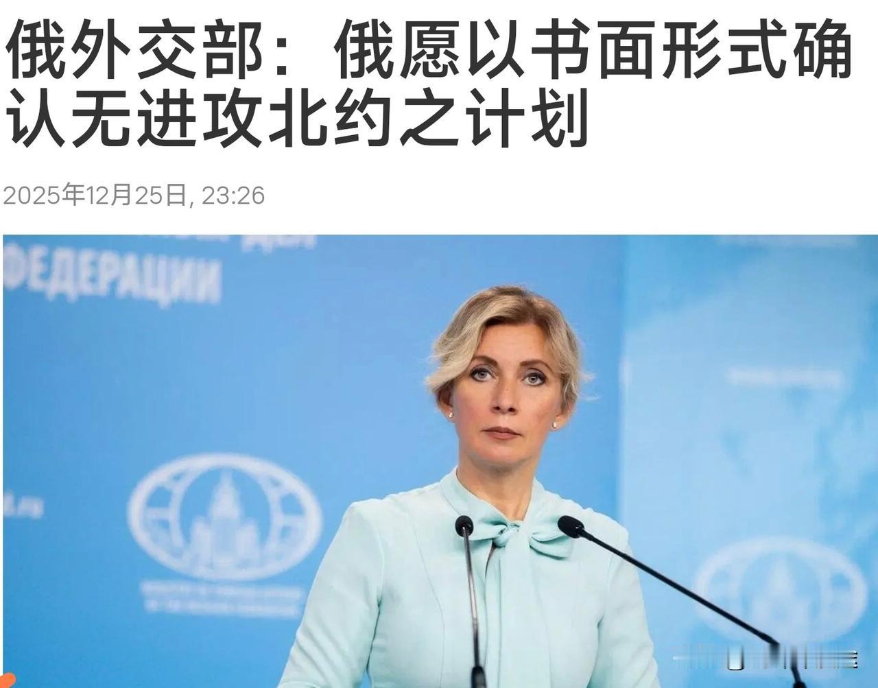 俄外交部:俄罗斯可以“书面方式“写下承诺:无进攻北约及欧盟计划! 这是 12 月 25 日俄外交部郑重的向北约及欧盟发出“和平 与友好的”强烈信号!同时也表达了俄罗斯愿意与欧洲展开对话的态度。 俄外交部表示:俄罗斯写下的“书面承诺”是具有法律约束的承诺,可以视为一份完整的国际法律文书,可供世界监督的法律文书! 从俄罗斯外交部的发话来看,俄罗斯也十足的诚意来化解欧洲国家的担忧与困惑,而俄罗斯也愿意用法律的形式向国际世界公开承诺从此不会向欧洲及北约发起军事进攻。当然除非北约及欧洲向俄罗斯发起攻击之外。 随着俄乌冲突即将四周年之际,俄罗斯此时向欧盟做出保证来看,也希望欧洲国家不要再向乌克兰提供军事援助,让俄乌之间的冲突尽快结束,而欧洲所担心被俄罗斯打击 俄罗斯可以保证绝对不会发生这样的事情,俄也没有这方面的军事计划。 不过欧洲如何看待俄罗斯愿写下承诺书呢?接下来就看欧洲国家的实际行动了。俄罗斯的诚意能否打动欧洲国家呢,而就在美国渐渐退出俄乌冲突的军事援助之后,欧洲国家将要在没有美国参与的情况之下,对乌克兰进行军事援助,可想而知,当下的欧洲已经不再是四年前 的欧洲了,欧盟国家经济下滑 军事力量严重不足,而美国对欧盟关税的施压,让欧盟经济更是雪上加霜。 如果欧盟认可与俄谈判 并写下“承诺书”,俄不会攻打欧洲,而欧盟也将不再支持乌克兰,相信俄乌冲突就很快结束!同时欧盟的经济也将会逐渐向好发展!