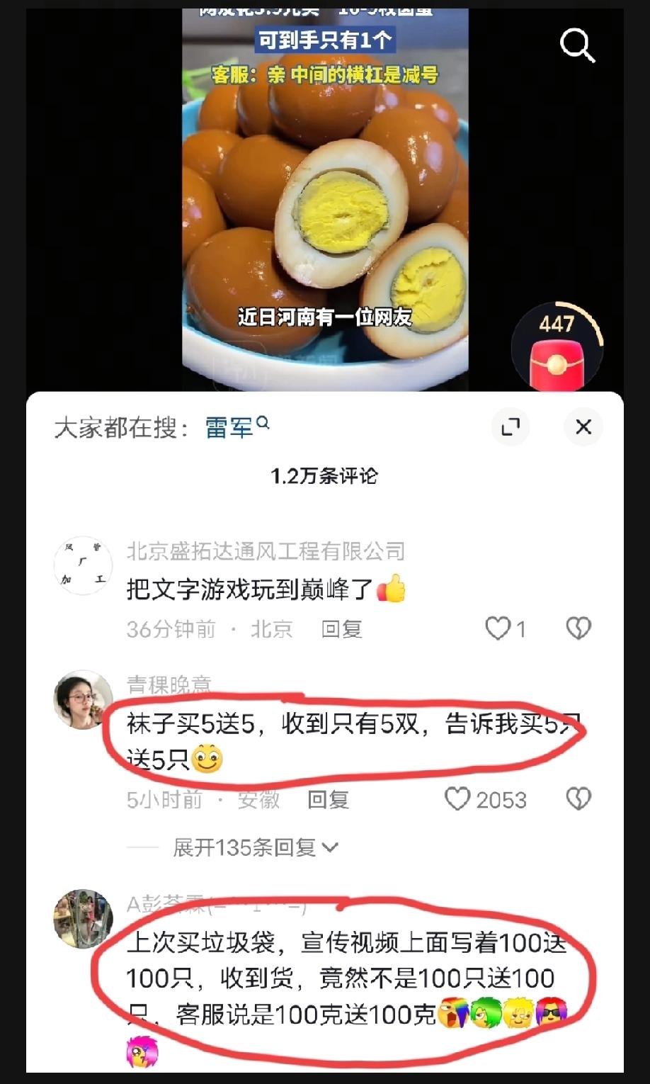 河南网友花3.9元在电商平台上买“10-9枚卤蛋”,最后拿到手却只有一个卤蛋。询问客服,给出的答复让网友哭笑不得:“亲,中间那个是“减号”,10-9=1,没错吧”…… 评论区网友更是分享了相同的经历: “袜子买5送5,收到只有5双,告诉我买5只送5只”。 “上次买垃圾袋,宣传视频上面写着100送100只,收到货,竟然不是100只送100只,而是100克送100了”。 …… 更让人无语的是,评论区很多网友居然不约而同的点了某米公司和某总这个人,这跟这个公司和这个老总八竿子打不着,怎么又扯上他们呢?