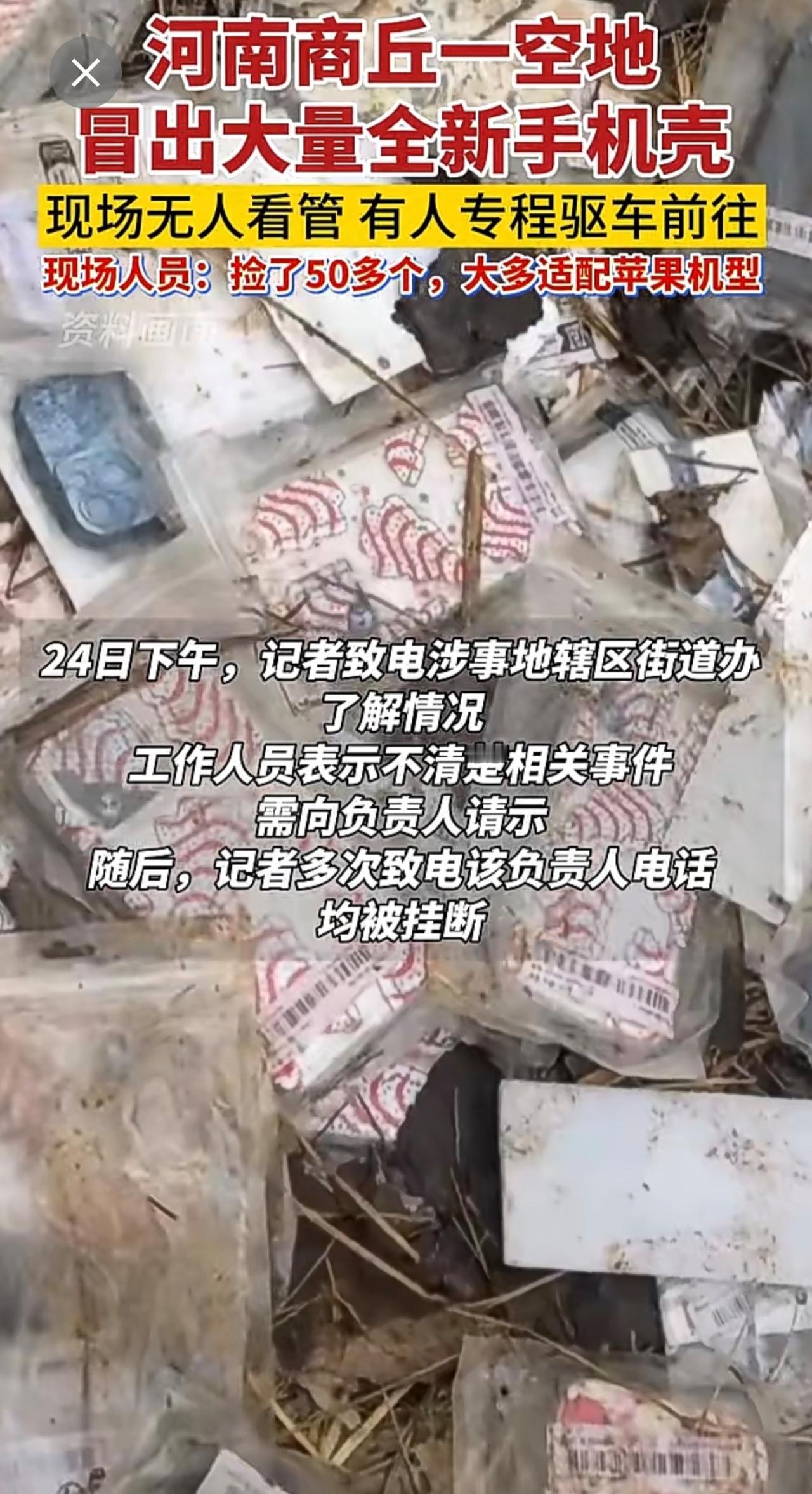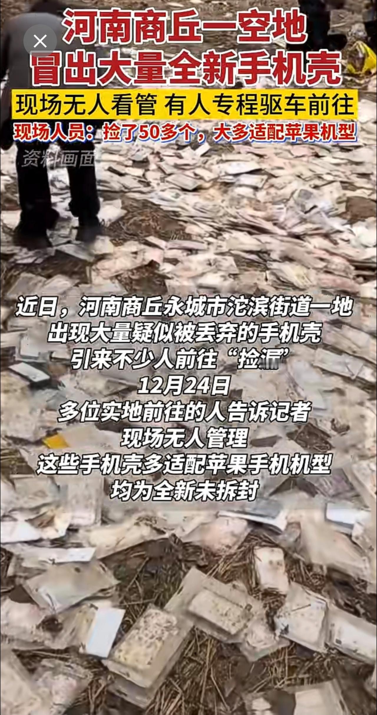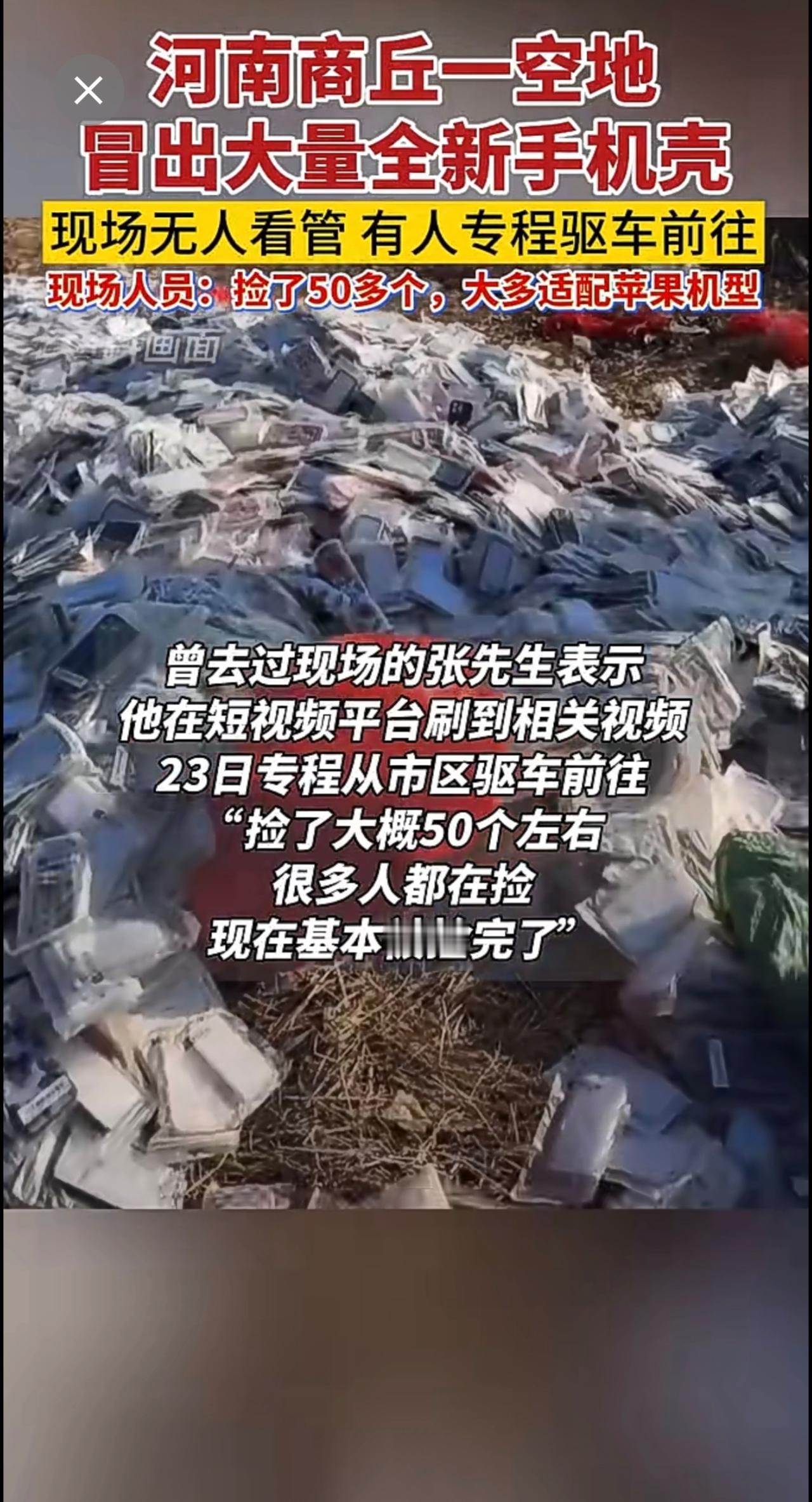 近日,河南商丘一空地冒出大量全新手机壳,现场无人看管有人专程驱车前往,现场市民:捡了50个,大多适配苹果机型。(极目新闻)