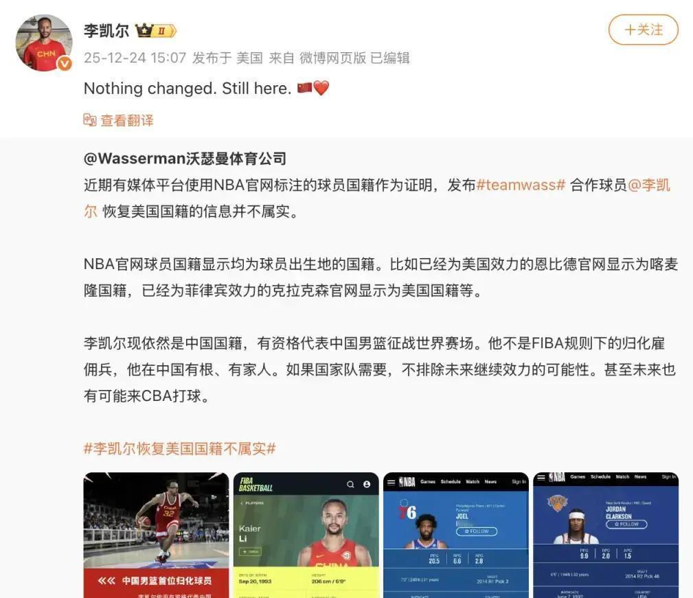 撕开NBA官网,看见“国籍:美国”,就断定李凯尔退籍?这是我听过最愚蠢的谣言。 那行字不代表国籍,只标注出生地。恩比德出生在喀麦隆,现在为美国队打球,官网照样写喀麦隆。规则一直如此。 李凯尔是血缘归化,外曾祖父是中国人。FIBA白纸黑字允许每队一名归化球员,他手续全合规。去年世界杯,他为中国队拼到抽筋,你忘了? 主帅乔尔杰维奇刚喊话:国家队大门,永远为愿意效力的人敞开。好几支CBA球队已经伸手接触,探他生涯末期的意向。 一个球员的真心,不在官网的数据库里。在他晒出的国旗上,在他拼抢的每一个地板球里。未来某天,也许你真能在CBA主场看到他。 这不是一次雇佣,这是一场归乡。重要的不是地图上那条线,而是血脉里那条根。他做出的选择,比任何标注都更有力。