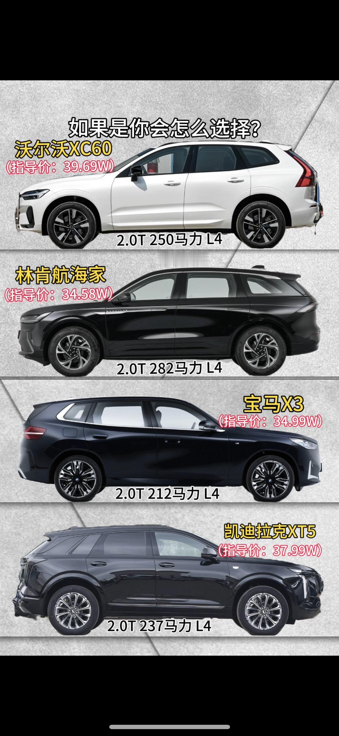 豪华中型SUV抉择:四款车型各有千秋 在豪华中型SUV市场,沃尔沃XC60、林肯航海家、宝马X3与凯迪拉克XT5始终是消费者关注的焦点,四款车型各有鲜明特质,选车需贴合自身需求。 沃尔沃XC60指导价39.69万,2.0T发动机输出250马力,以极致的安全性能和北欧简约设计为核心卖点,适合注重家庭安全的用户。林肯航海家指导价34.58万,282马力的动力表现在四款车中最为亮眼,美式豪华的内饰质感与静谧性是其优势,性价比突出。 宝马X3指导价34.99万,212马力虽稍弱,但宝马的操控基因让其驾驶乐趣独树一帜,适合追求操控的车主。凯迪拉克XT5指导价37.99万,237马力兼顾动力与平顺,美式舒适的底盘调校和大空间,契合家用与商务双重需求。 四款车覆盖了安全、动力、操控、舒适等不同维度,选车时锚定核心需求,便能找到最适配的那一款。