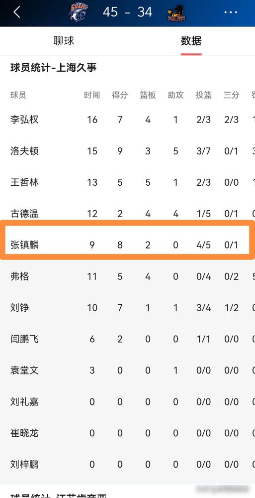 上海久事新援张镇麟终于吃回饺子了!在今天上海久事主场迎战江苏肯帝亚的比赛中,目前双方半场战罢,上海久事以45:34领先对手。 半场高效拿下8分,张镇麟这状态回得正是时候。但一场比赛吃顿饺子,和整个赛季稳定输出,那可完全是两码事。 看看他这赛季的数据曲线。加盟上海前,他在辽宁队后期状态明显起伏。投篮选择、防守专注度都受过质疑。这场5中4,确实漂亮,可样本太小了。球迷都记得,他有过高光,也有过整场迷失的时候。 上海队今年目标肯定不止是季后赛。他们内线有王哲林,外线需要稳定的火力点。张镇麟的身体天赋没得说,身高臂展,运动能力在国内锋线里是顶级的。关键就在于“稳定”二字。他的持球进攻和防守经验,还需要更多硬仗来打磨。 这场对手江苏队,实力不算顶尖。真正的考验还在后面。广东、辽宁、浙江这些强队,防守强度上来,还能不能保持高效?这才是上海队管理层和球迷最关心的。 张镇麟需要证明的不是一场能得多少分。而是能否成为球队体系里可靠的一环。在攻坚时刻敢出手,能得分。在防守端不掉链子。这才是顶级锋线该有的样子。 上海队想夺冠,光靠外援和大王不够。国内球员必须站出来。尤其是张镇麟这样的年轻国手,被寄予厚望。他的成长速度,直接关系到球队的上限。 球迷们期待了很久。从他出道时的惊艳,到后来的起伏,心情也跟着起起落落。大家都希望他能真正打出来,成为中国男篮锋线的答案。所以看到一场好表现,才会这么高兴。 路还很长。一场比赛的好状态,是个好开头。但千万别捧得太高。脚踏实地,一场一场去拼。把防守做好,把空位投进,再慢慢提升处理球的能力。 对于年轻球员,多些耐心,多些鼓励。但也别回避问题。打得好夸,打得不好也得指出问题。这才是真正为他好,为球队好。 篮球是团队运动,个人爆发固然可喜,融入体系才是根本。希望张镇麟能借这场东风,真正找到在上海队的角色和节奏。那上海队的冠军梦,才更有看头。 竞技体育,最终靠实力和成绩说话。是金子总会发光,是球星总要经历锤炼。我们拭目以待。 MCN双量进阶计划