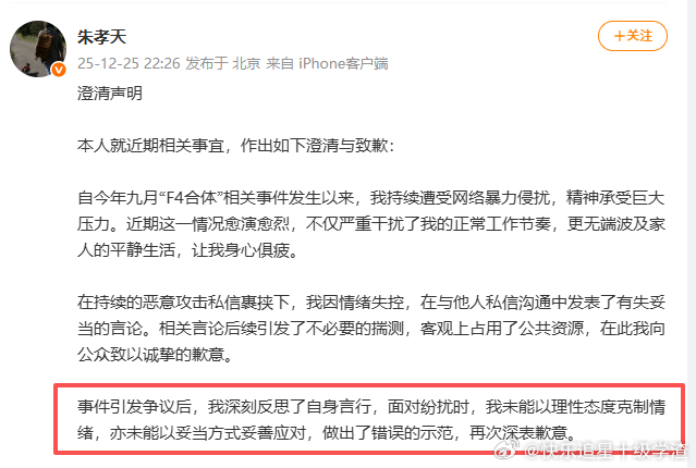朱孝天澄清声明 朱孝天可以按照自己的道歉说明里提及以理性态度克制情绪吗?这次可以相信他吗,持怀疑态度观望一下