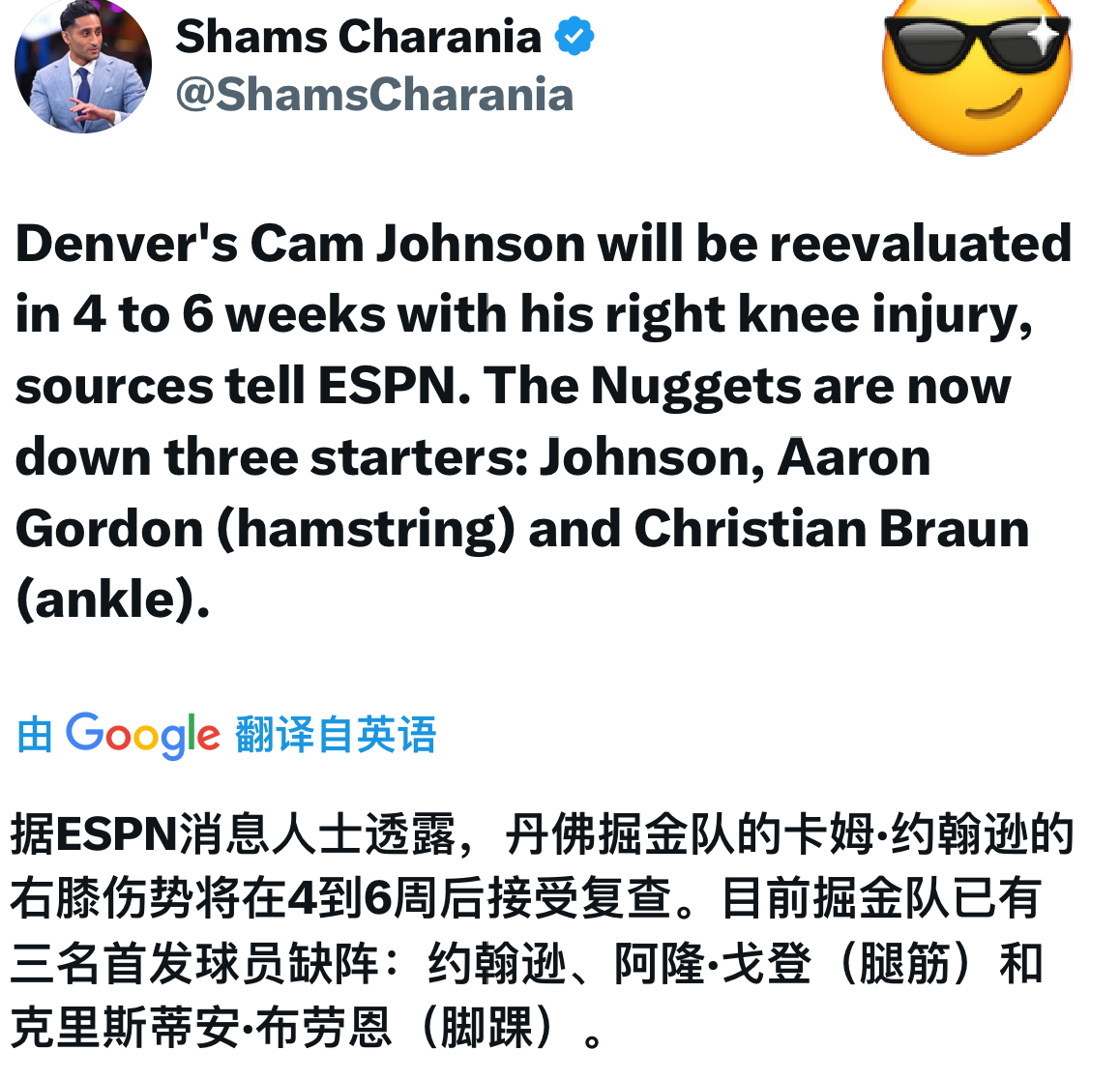 在昨天,Shams发布消息表示,卡梅隆-约翰逊并没有遭遇组织结构损伤,并不会赛季报销。 而在刚刚,他再次发布消息更新了约翰逊的伤情,据内部消息人士透露,约翰逊的右膝伤势,预计将在4-6周后接受复查。 而加上月约翰逊,目前掘金队已经有三名首发球员将持续缺阵,分别是约翰逊(膝盖扭伤),阿龙-戈登(腿筋伤势),以及克里斯蒂安-布劳恩(脚踝伤势)。